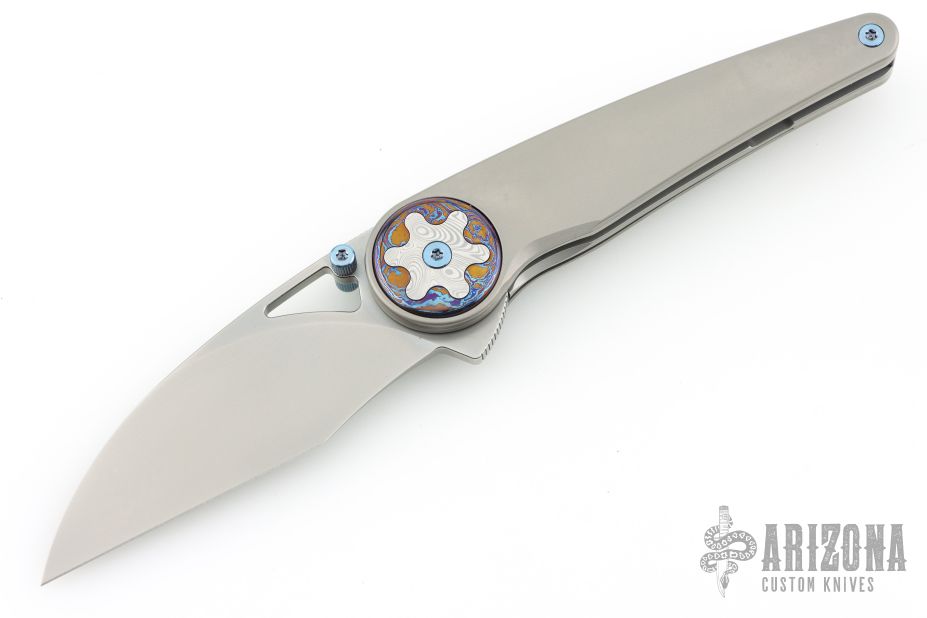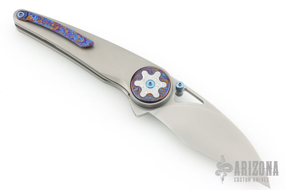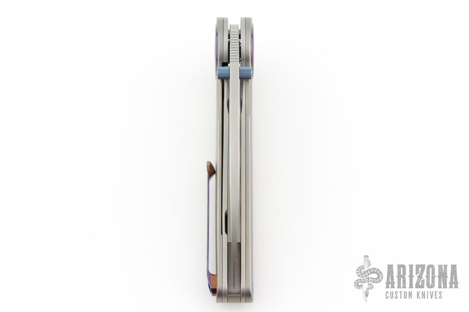 At the heart of the Happy Hour’s design is its striking pivot collar—an outer ring of Timascus encircling a gear-shaped Damasteel inlay, creating a mesmerizing focal point. Complemented by blue anodized hardware and a matching Timascus pocket clip, every element of this knife speaks to artistry and refinement.