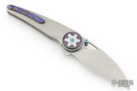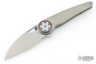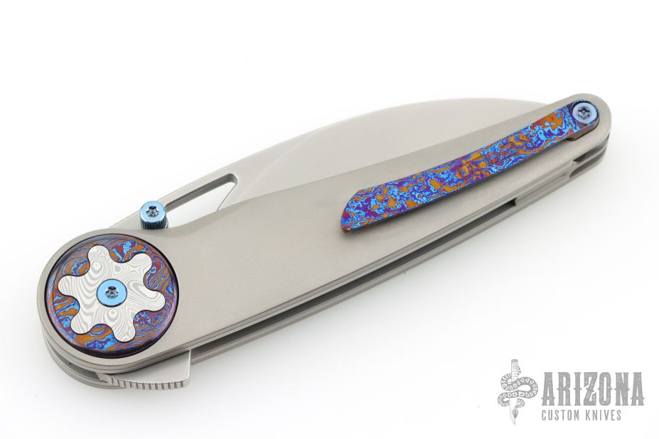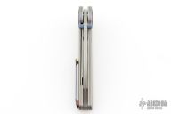 The 4.57” (11.6 cm) handle, precision-machined from 6AL-4V titanium, provides a comfortable, ergonomic grip, further elevated by the intricate Timascus / Damasteel inlay. The liner lock has robust profile with a precise and secure lock-up.
