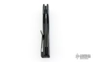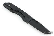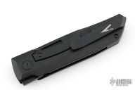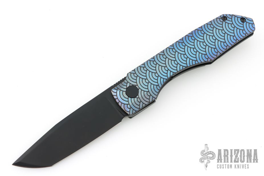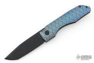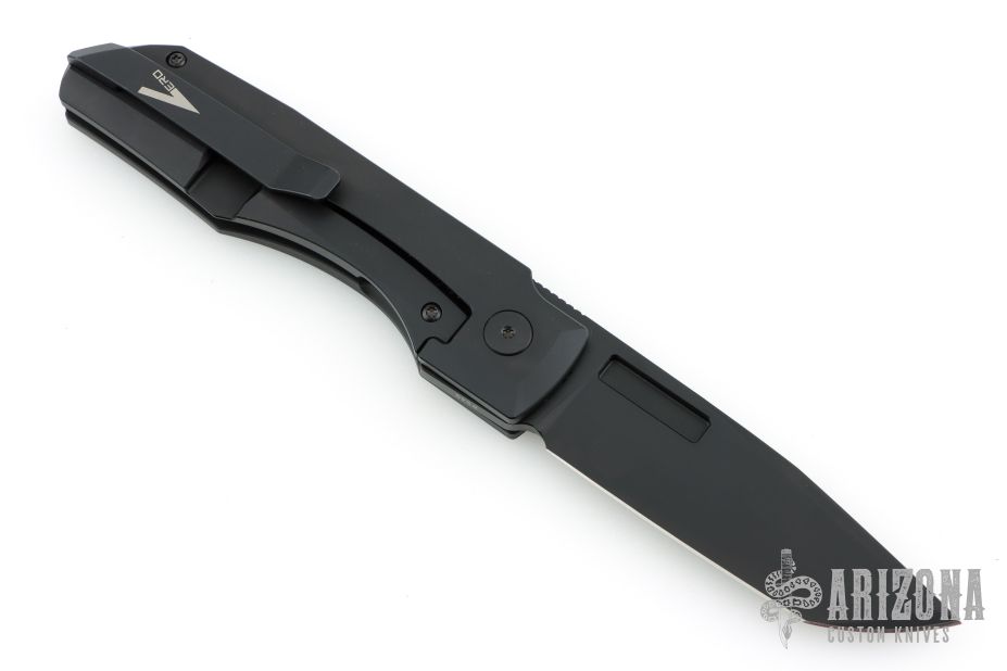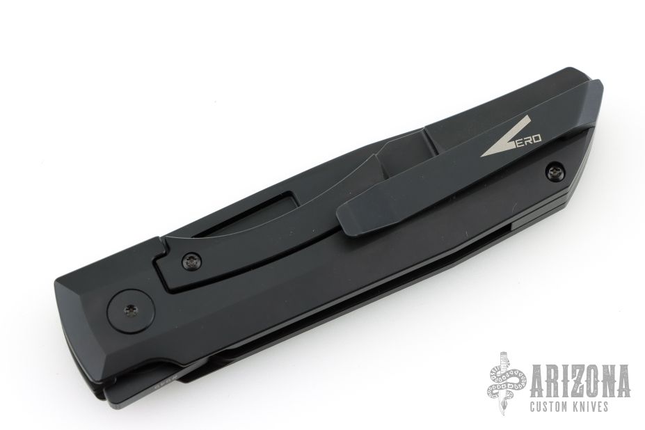 This Impulse by Vero Engineering features a black washed blade with notched thumbrest and flipper. The handle has a laser engraved, anodized titanium frame with black titanium hardware, tip up clip with hidden screws and backspacer. Nice detent, lockup and blade seating. Comes with a zippered case, box, and COA. #949. Excellent condition.