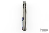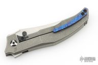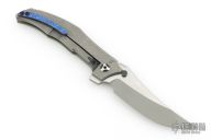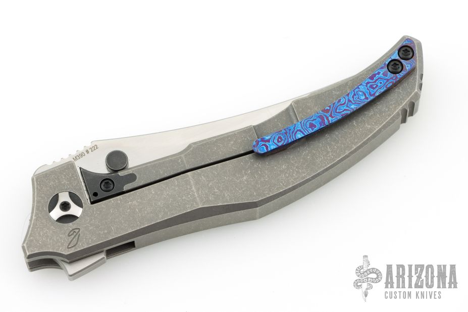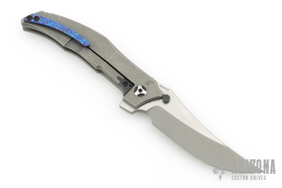 This Persian by Custom Knife Factory is a Peter Rassenti Design.  The knife has a two-tone finished blade with a notched thumbrest and flipper. The handle has a tumbled titanium frame with tip up zircuti clip, lanyard hole, stainless lock face insert with overtravel stop.  Zircuti pivot collars. Rides on bearings, nice detent, lockup and blade seating. #263 on flipper tab. Comes with original nylon Velcro case, extra hardware and COA Dated 10/24 and #222. Excellent condition.
