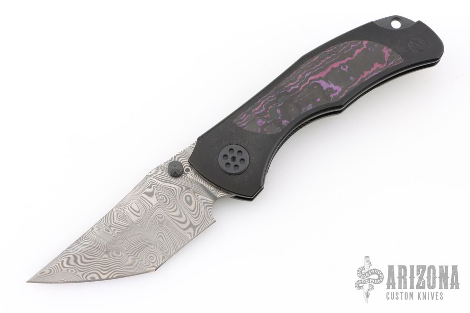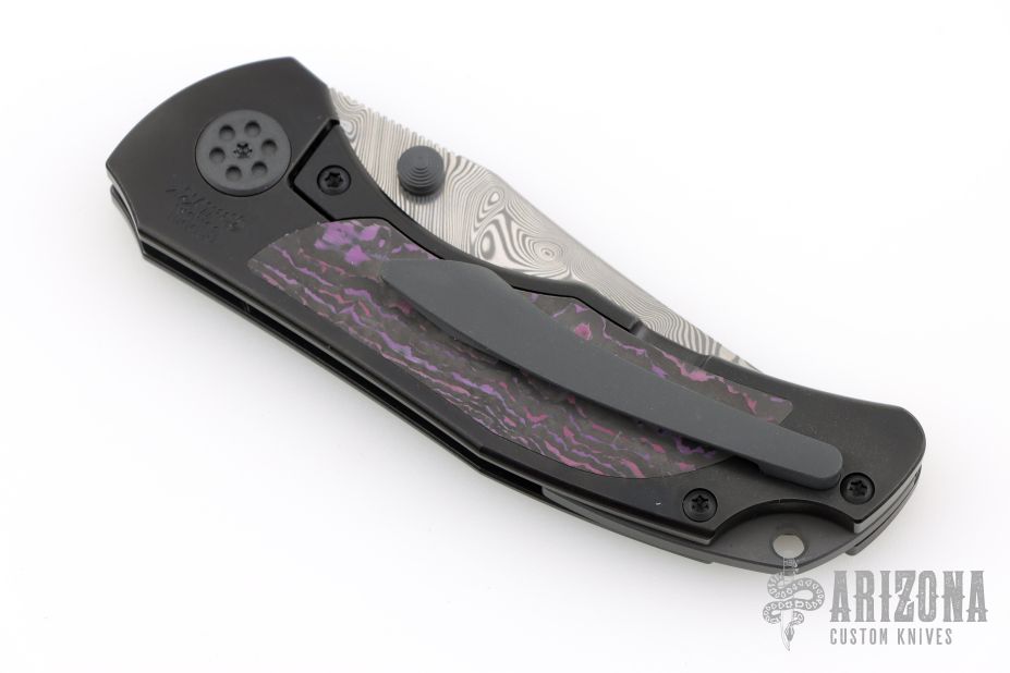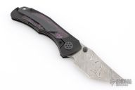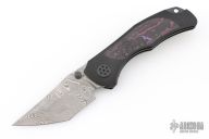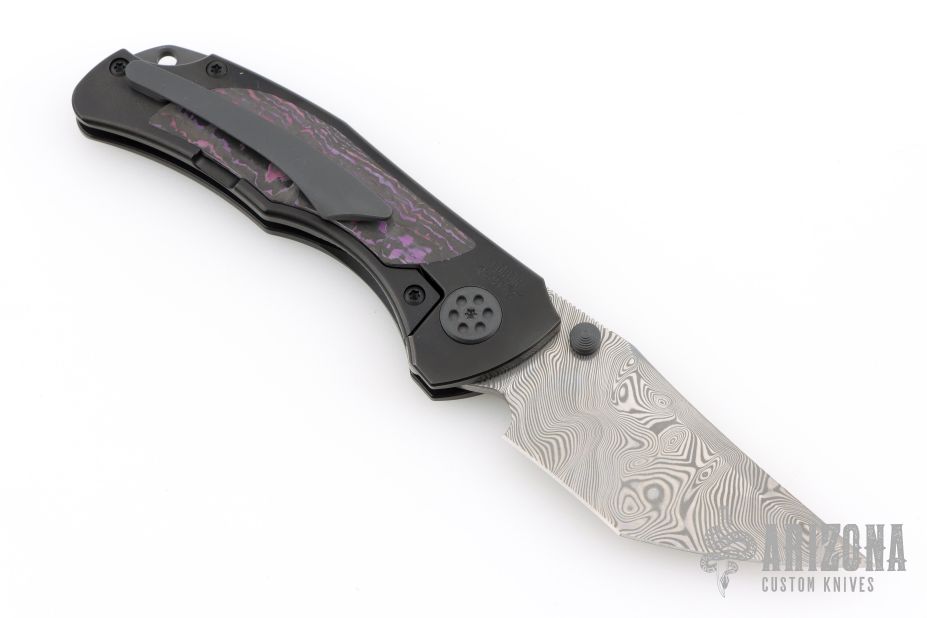 Grace comes in both inlay and non-inlay versions. This particular configuration features purple haze fat carbon inlays, black handles, and a Damasteel blade. Expertly executed with precision by Reate Knives.