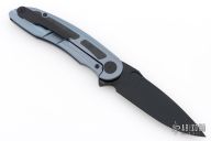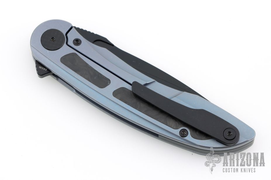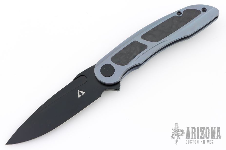 Model/Item/Part - CMB07B. CMB Made Knives - Knight Framelock Blue. 4.75" (12.07cm) closed. 3.75" (9.53cm) black coated Bohler M390 stainless blade. Blue titanium handle with carbon fiber inlay. Extended tang. Pocket clip. Black nylon zippered storage case. Boxed. Made in China.
