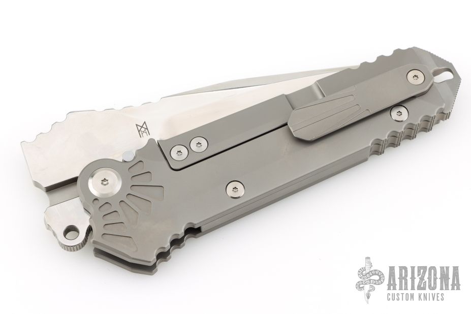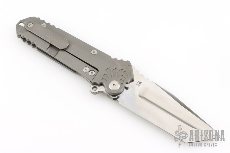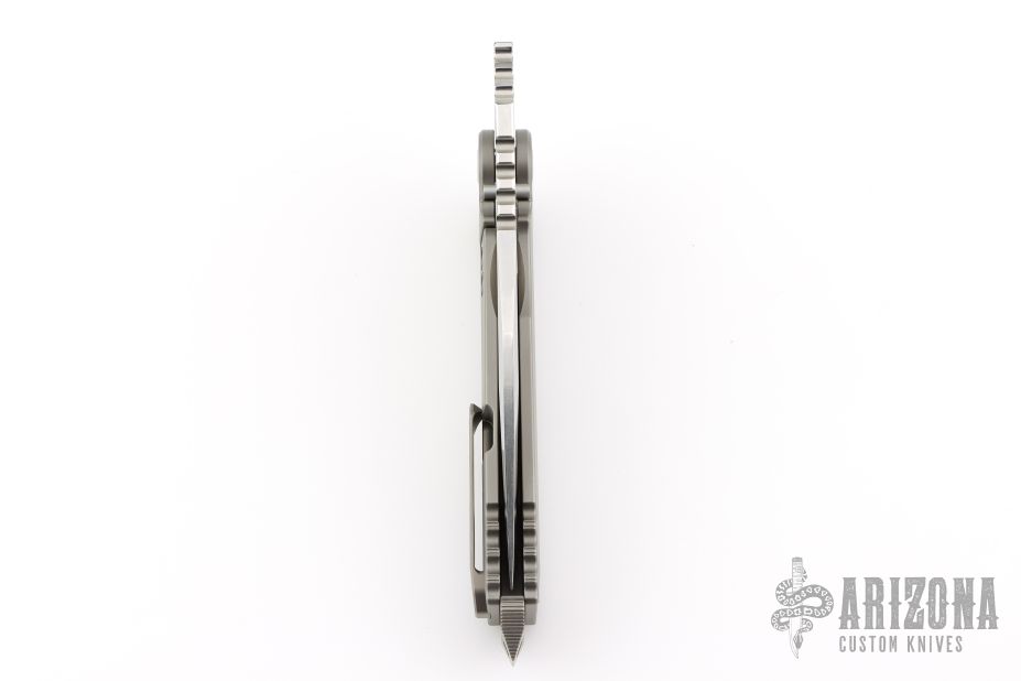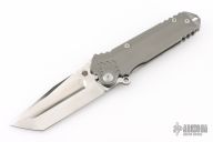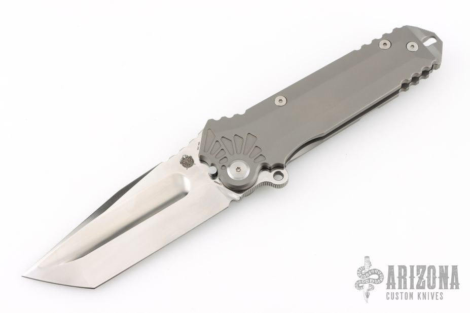 The Boss by PMP/Midgards Messer features a satin/polish finished clip point tanto style blade with a notched thumbrest.  The handle has a milled and bead blast finished frame with a tip up titanium pocket clip.  Comes with original box.  Excellent Condition.