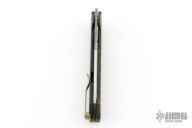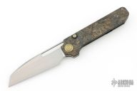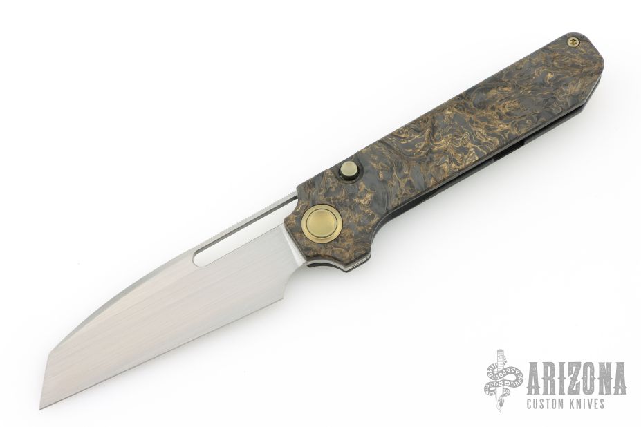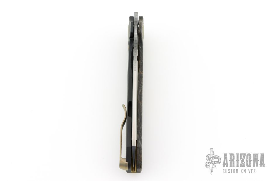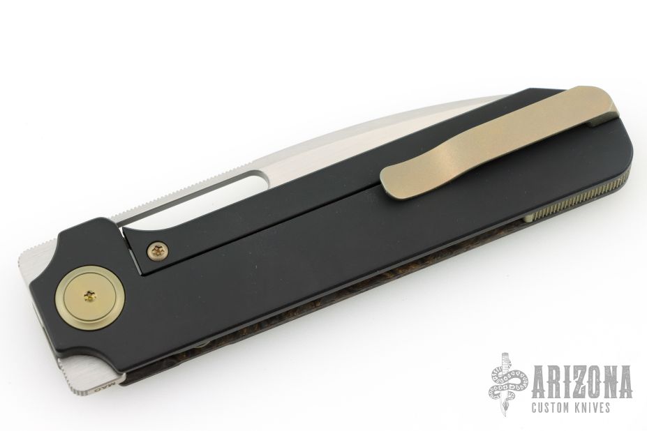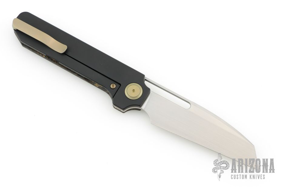 This Caliber by Golden Designworks features a hand rub satin finished blade with thumbhole and notched thumbrest. Works well as a front flipper. The handle has milled black finished titanium scales, gold carbon fiber cover scale, gold anodized titanium backspacer and tip up clip. Comes with original box, zippered case and papers. Excellent condition.