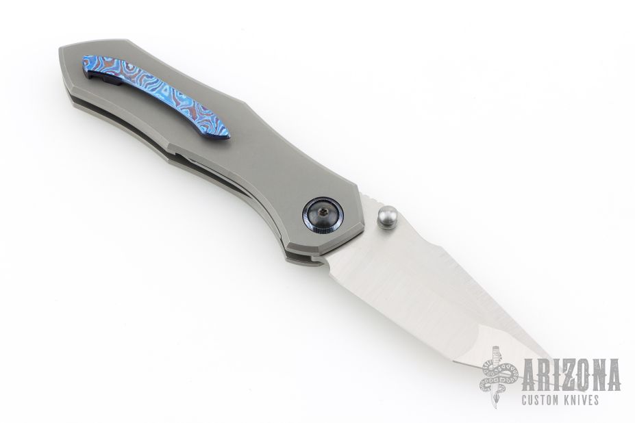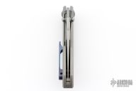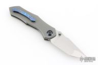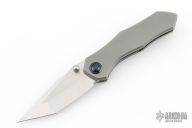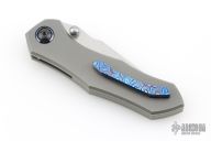 This Neutron Star by GoodSkrew features a satin finished blade with dual thumbstuds and notched thumbrest. The handle has a stonewashed titanium frame with timascus pivot collars, titanium backspacer and a Timascus tip up clip with hidden screws. Inlaid titanium locking liner. Comes with original box, papers, and case. Excellent condition.