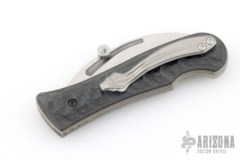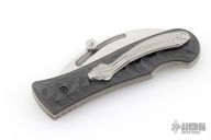 This Elvia Slipjoint Folder by Korth Cutlery features a stonewashed hawkbill blade with fuller and thumb stud. The handle has black carbon fiber scales, orange peel finished titanium liners and a tip up titanium clip with steel spring. Comes with zipper case and card. Nice walk and talk! Excellent condition.