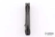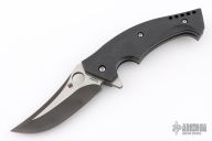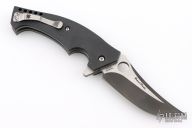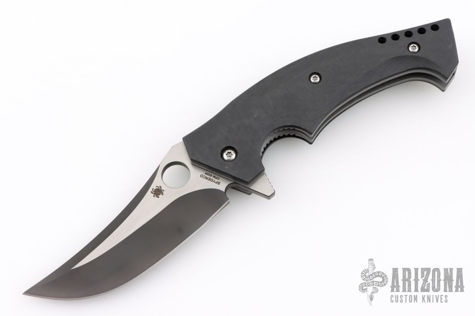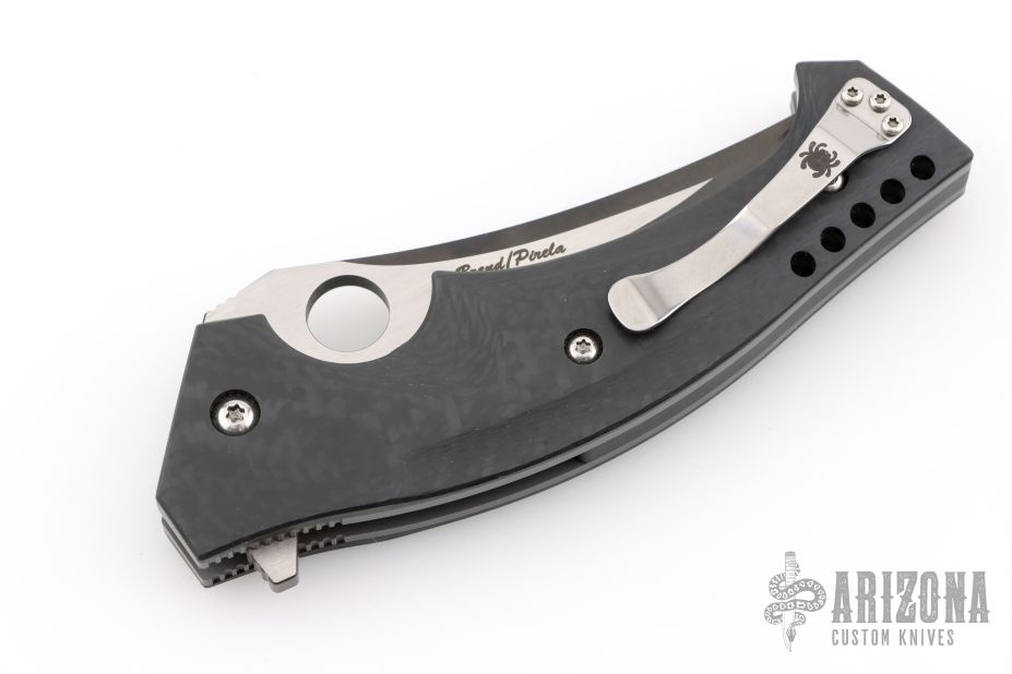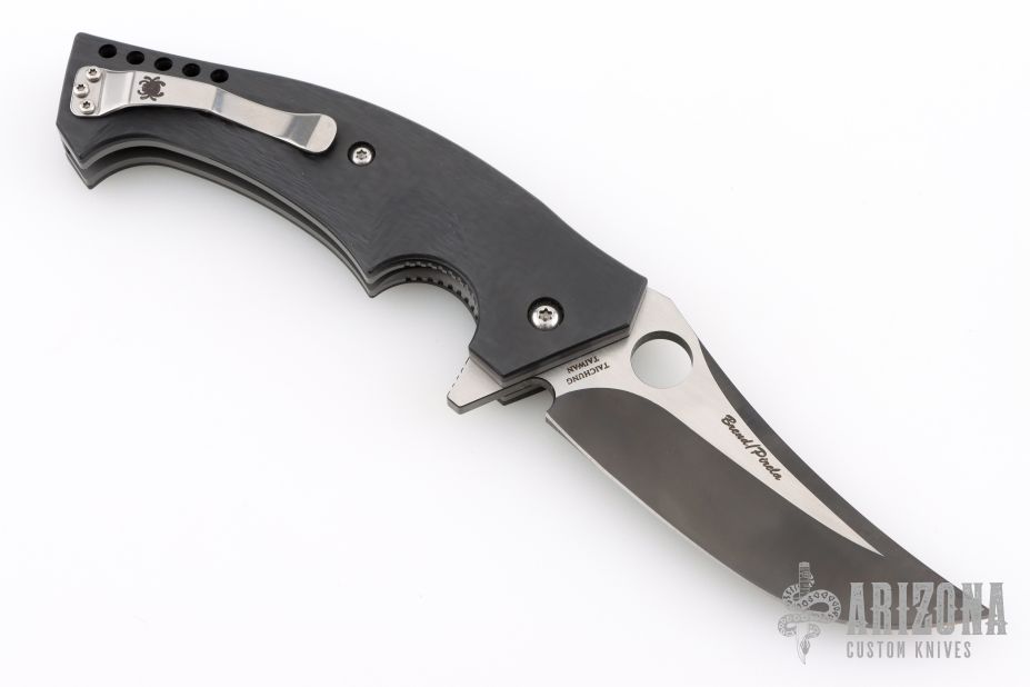 This Mamba flipper is a Walter Brend and Joel Pirela design executed by Spyderco. It features a two tone blade with satin finish flats and black grinds. Notches on blade spine and spine of handle. Carbon Fiber scales, bead blasted titanium liners, black G-10 backspacer, and a tip up stainless steel clip. Smooth function with a nice lock, detent and blade seating dead center. Hidden lanyard pin at the butt. Comes with a padded and zippered Spyderco case. Excellent condition.