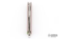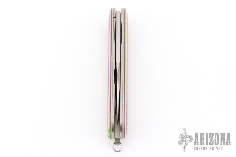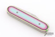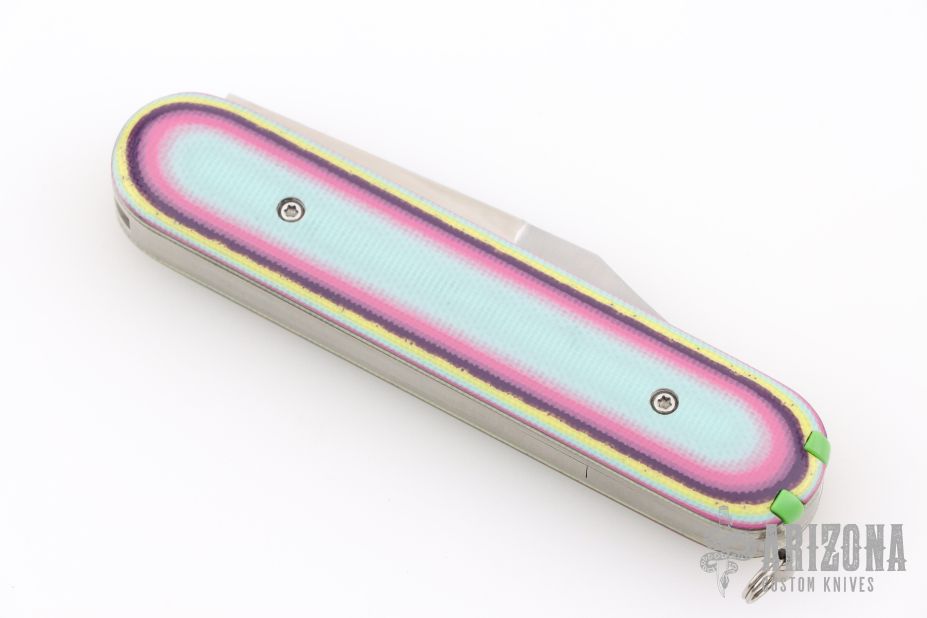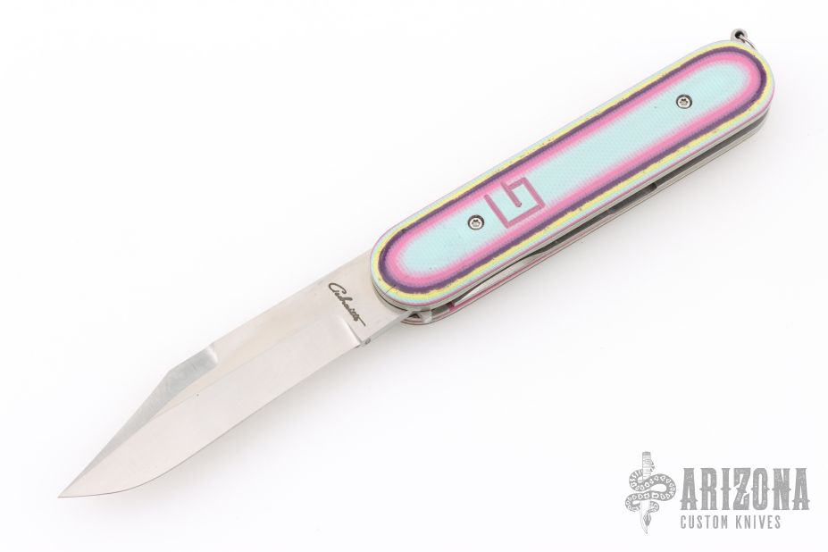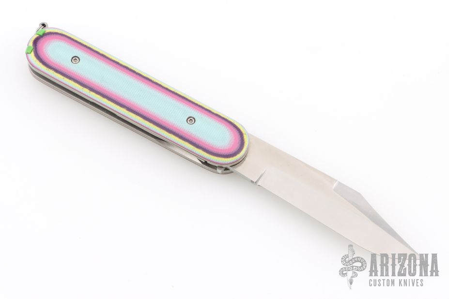 This Switch Army Switchblade by Chuck Gedraitis features a satin finished blade with false top edge. The handle has retro G10 orange peel finished titanium liners, orange peel finished stainless steel backspacer with lanyard hole. Has tweezers and toothpick like a Swiss Army Knife. Nice action, lockup and blade seating. Comes with a zippered case and COA dated 2024. Excellent condition.