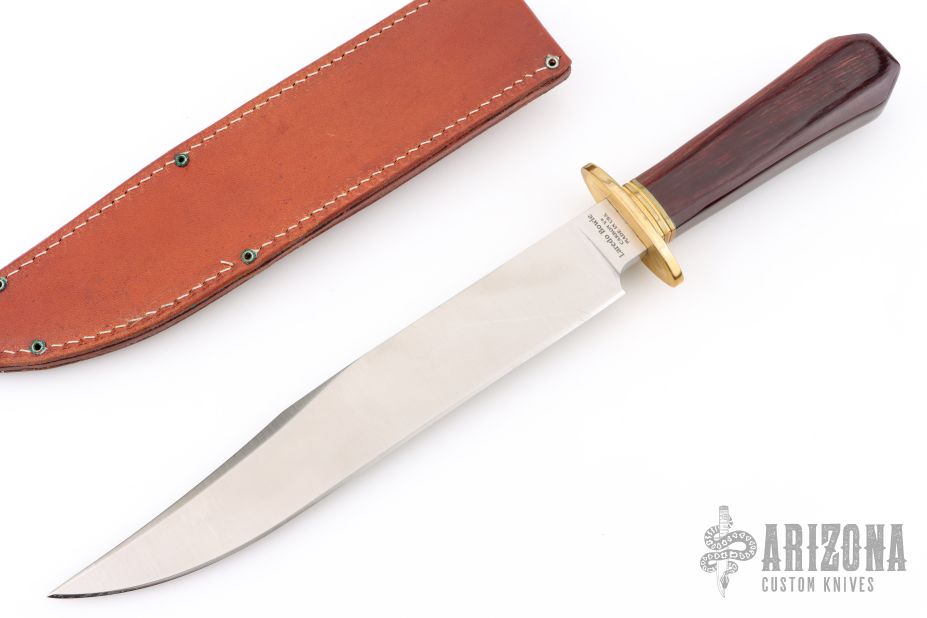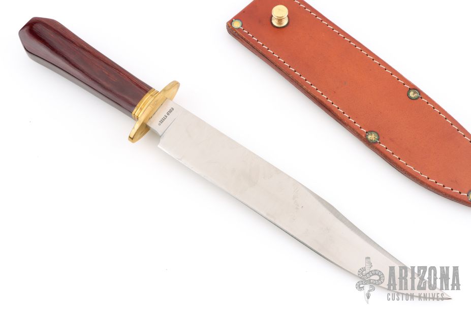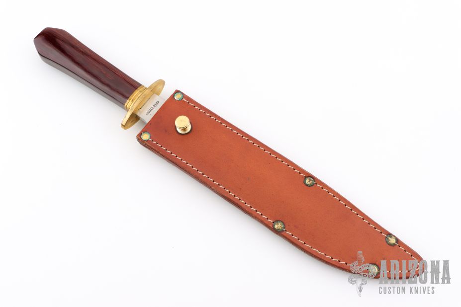This Laredo Bowie by Cold Steel features a satin finished blade with sharpened top edge, .290" blade stock and 1.513" blade depth, hidden tang construction. The handle has a brass guard and dymondwood grip. Comes with original box and leather sheath. Has some light scuffs, and patina. Excellent condition otherwise.