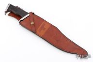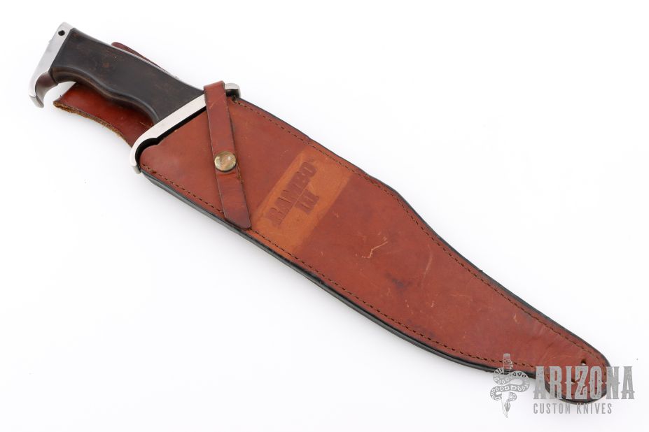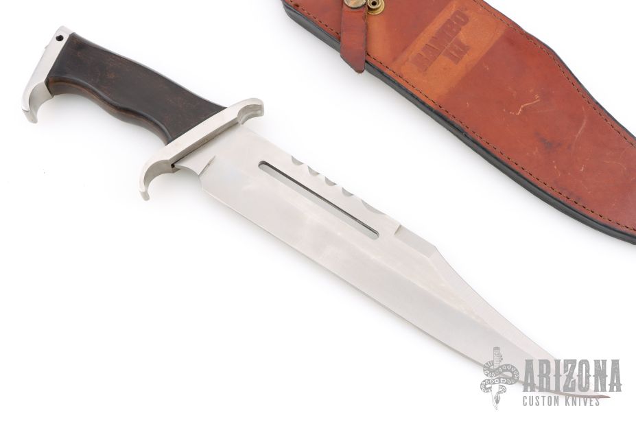 This Rambo III by United Cutlery features a double stainless guard and pommel with a stained wood grip. Blade is .238" thick and 1.937" deep. Satin finished blade with a nearly sharpened top edge, slot and fileworked spine. Hidden tang construction. Includes a brown leather sheath. Designed by Gil Hibben. Has some light scratches, otherwise excellent condition.