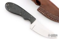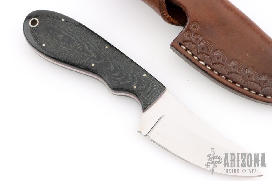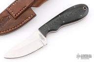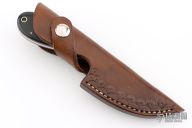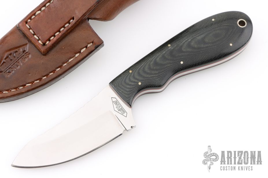 This knife by Florida knife maker Steve  Miller features a mirror polished blade with full tang construction, .134" Blade Stock and 1.208" Blade Depth. The handle has pinned micarta scales with a lanyard hole in the pommel. Includes brown leather sheath with a belt loop. Has a couple light scratches, other wise excellent condition.