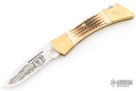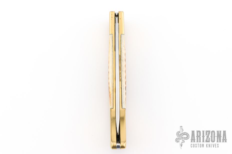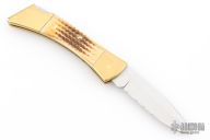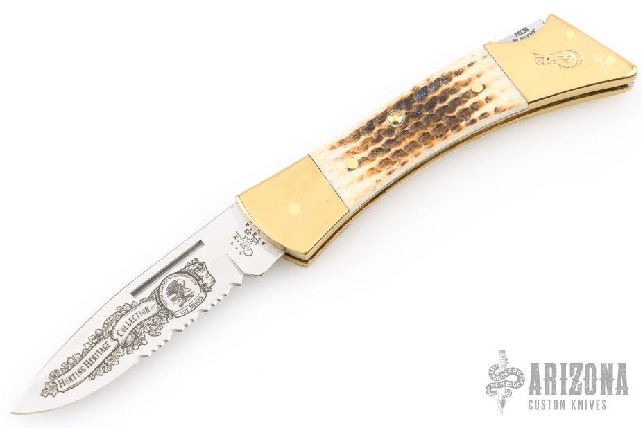This knife by Case Knives features a clipoint blade with a single nail pull and serrations. The handle features brass bolsters and frame along with stag scales. Light scratches are visible otherwise the knife is in excellent condition.