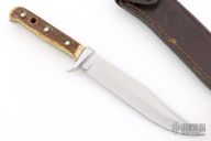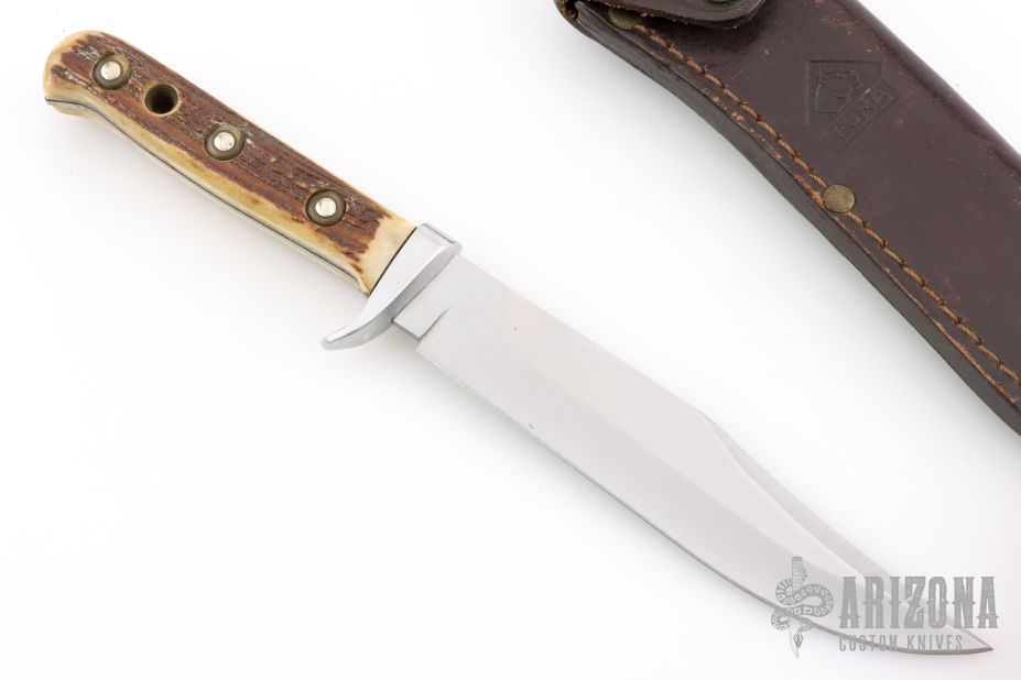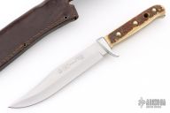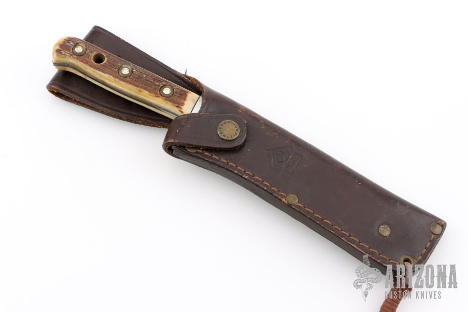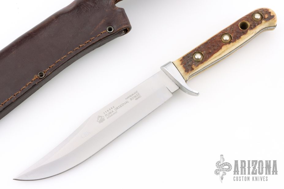 This Original Bowie by Puma features a satin finished blade with false top edge, .141" blade stock and 1.204" blade depth, full tang construction. The handle has an aluminum guard, stag scales and a lanyard hole at the butt. Comes with original brown leather sheath. Has some light scuffs and scratches, great condition otherwise.