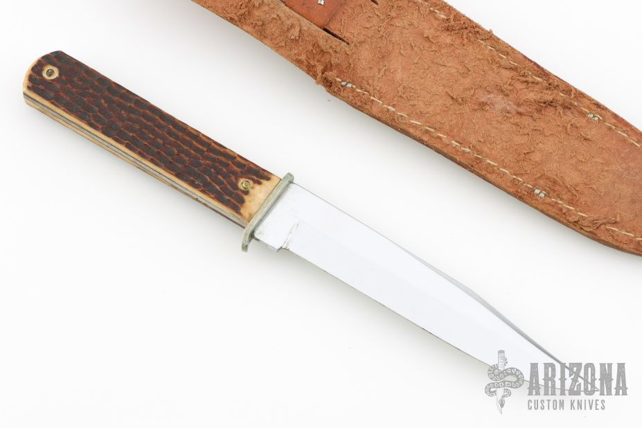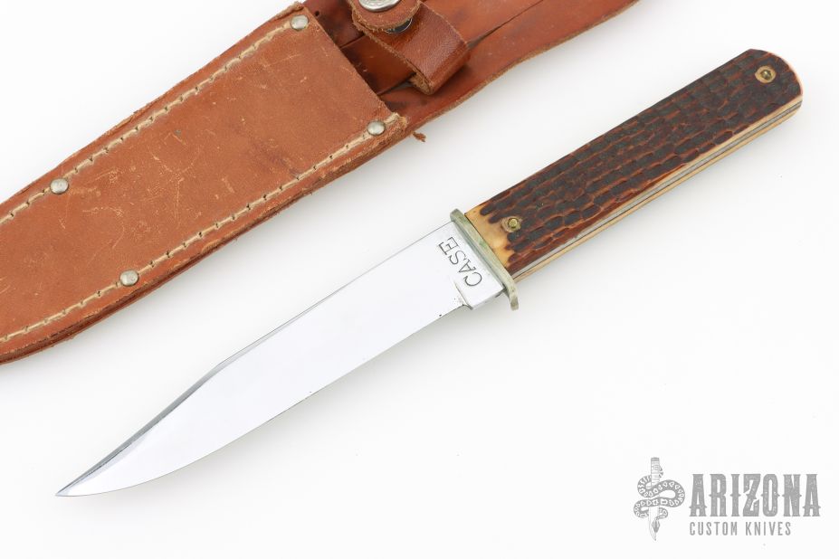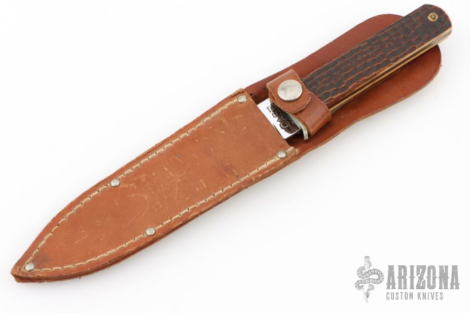 This Vintage Case knife features a mirror polished blade with .091" blade stock and .910" blade depth, full tang construction. The handle has a nickel silver guard, and stag scales. Comes with a leather sheath. Has some scratches and patina. Great overall condition.