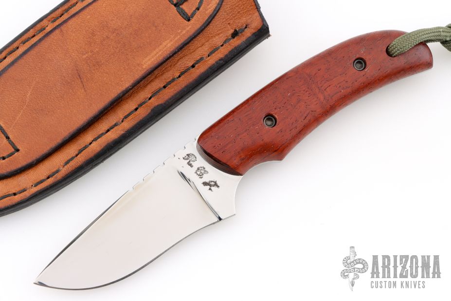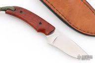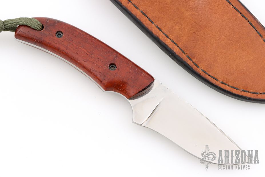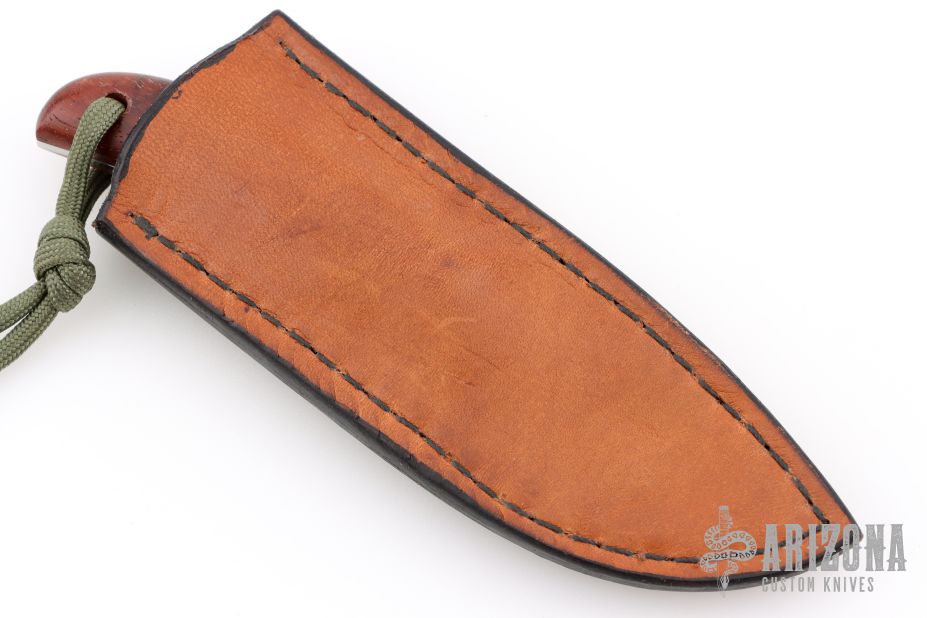 This knife by RB Johnson features a mirror finished blade with .110" blade stock and 1.109" blade depth, full tang construction. The handle has wood scales. Comes with a leather sheath. Has some light scratches, otherwise good condition.