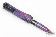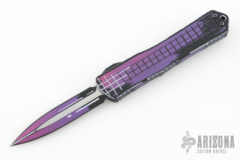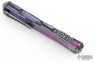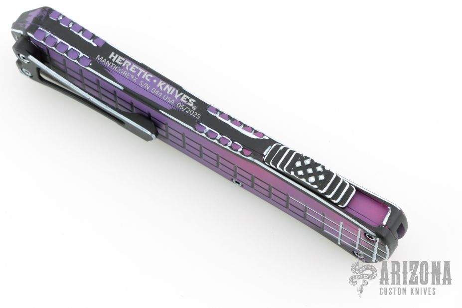This Manticore-X by Heretic Knives features a purple/black finished double-edged blade. The handle has a purple/black aluminum frame with black stainless steel hardware and tip down clip. Comes with original box and papers. #044 05/2025. Excellent condition.