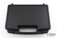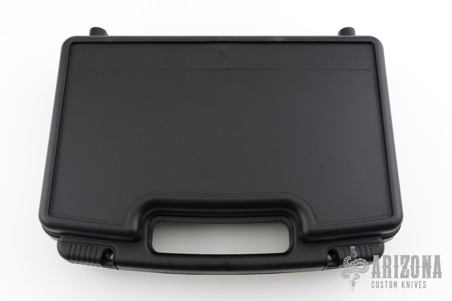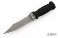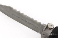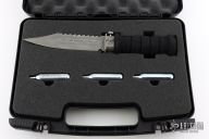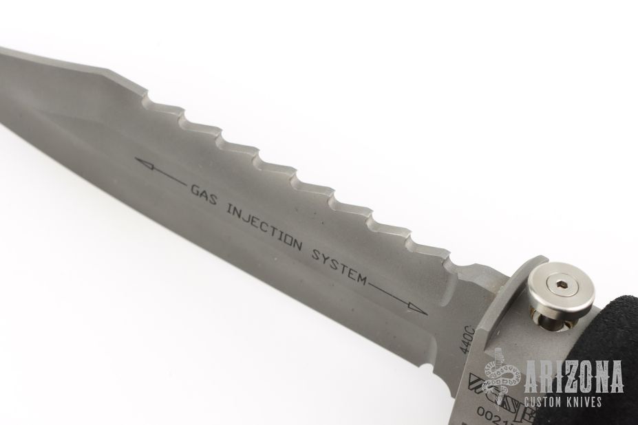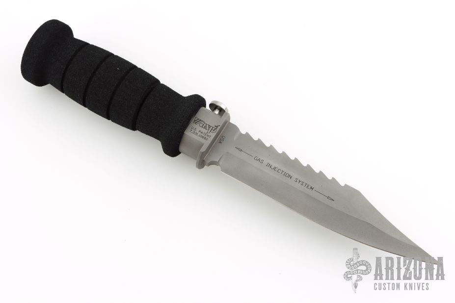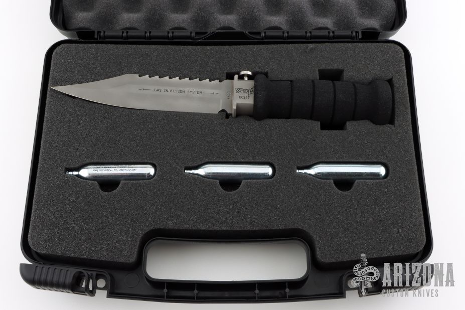 This Wasp scuba knife features a clip point blade with serrated spine, 1/4" blade stock and 1" blade depth, hidden tang construction. The blade has a gas injection system. The handle has a titanium guard with push button for CO2 release, and removable rubber handle where the CO2 cartridge is installed. Comes with original box, papers and 3 unused CO2 cartridges. Excellent condition.
