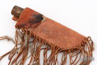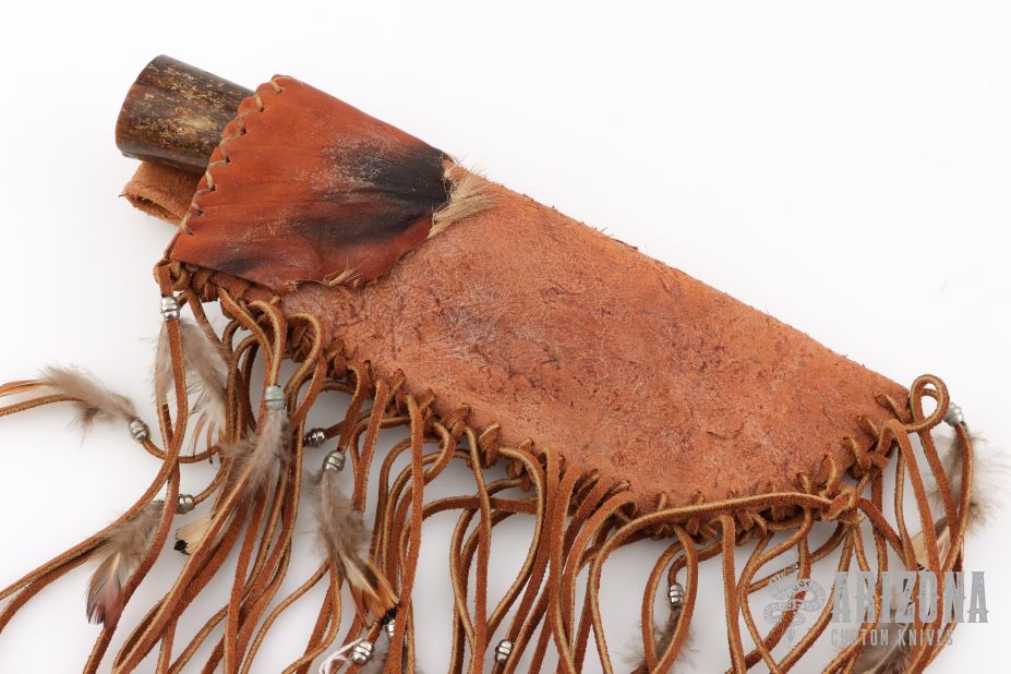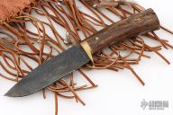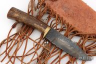 This Hunter by Jerry McClure features a blued blade made from a farrier's rasp, .187" blade thickness and 1.465" blade depth, hidden tang construction. The handle has a brass guard, fossil bone grip and an brass pin. Comes with a brown leather sheath with tassels. Has an intentionally rustic look. Excellent condition.