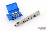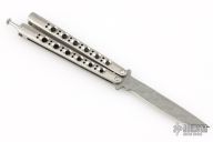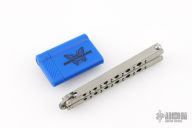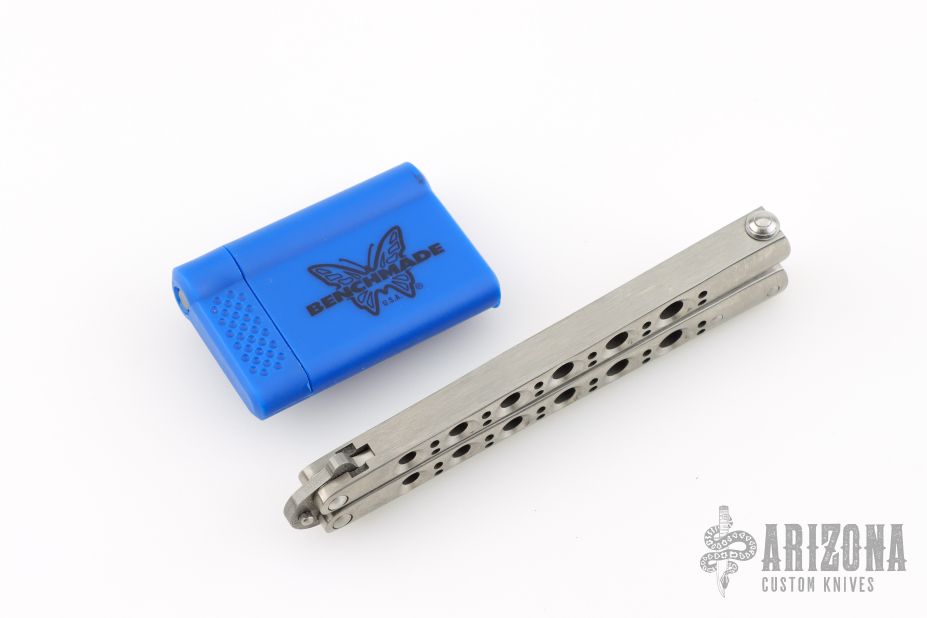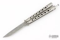This Model 42 Balisong by Benchmade features a Damascus blade with swedge. The handle is comprised of integral skeletonized titanium handles with spring T latch on pommel. Comes with Benchmade bit driver kit, and clamshell style box. There are some light scuffs, excellent condition otherwise.