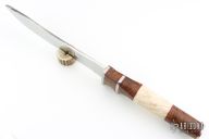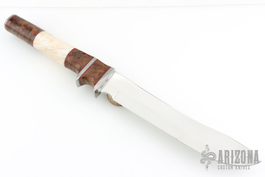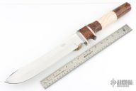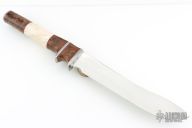 This knife features a large satin-finished, unswept blade with hidden tang construction.  .276" Blade Stock.  1.842" Blade Depth. The handle is fitted with a steel guard, burl and bone grip, and a steel butt plate. There are cracks present in the bone grip; otherwise, the knife is in good condition.