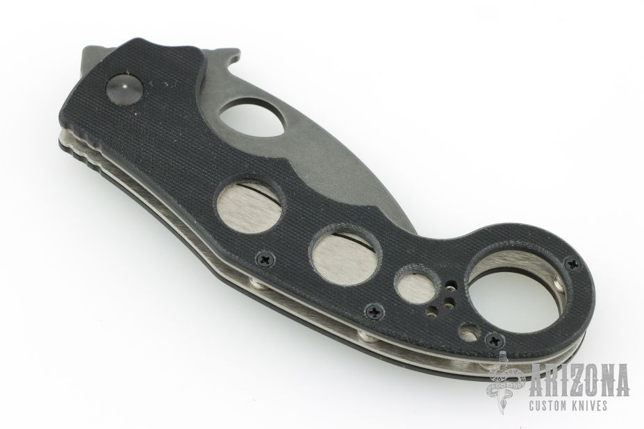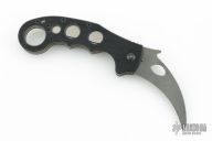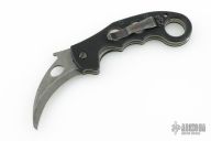 This Emerson Super Karambit has a thunder storm finished chisel ground hawk bill blade with notched thumbrest, thumbhole, flipper and wave feature. The handle has black G10 scales, titanium liners with and has a lanyard hole at the butt. Also has a black stainless steel clip positioned for right or left-handed tip up carry. Nice detent, lockup and blade seating. Serial number 0077.  Comes with original box and papers. Has some scuffs and scratches, good condition otherwise.
