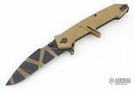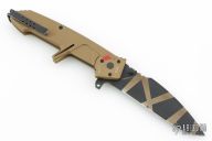 This knife by Extrema Ratio has a drop point blade with a notched thumb rest and dual thumbstuds. The handle has tan aluminum handle with stainless steel liner and clip, tip up reversible. Comes with original box and card. Has some light scuffs and scratches, great condition otherwise.