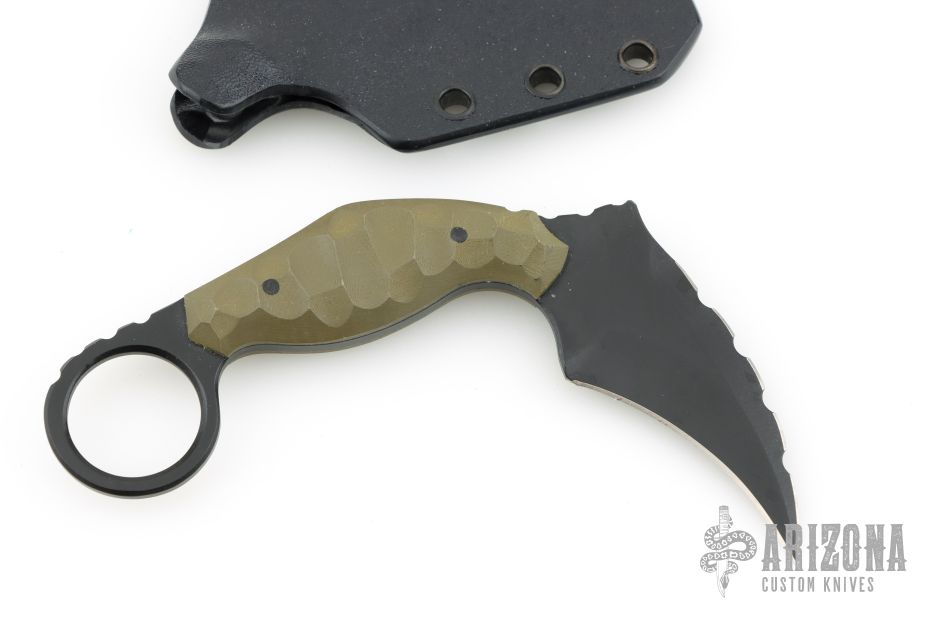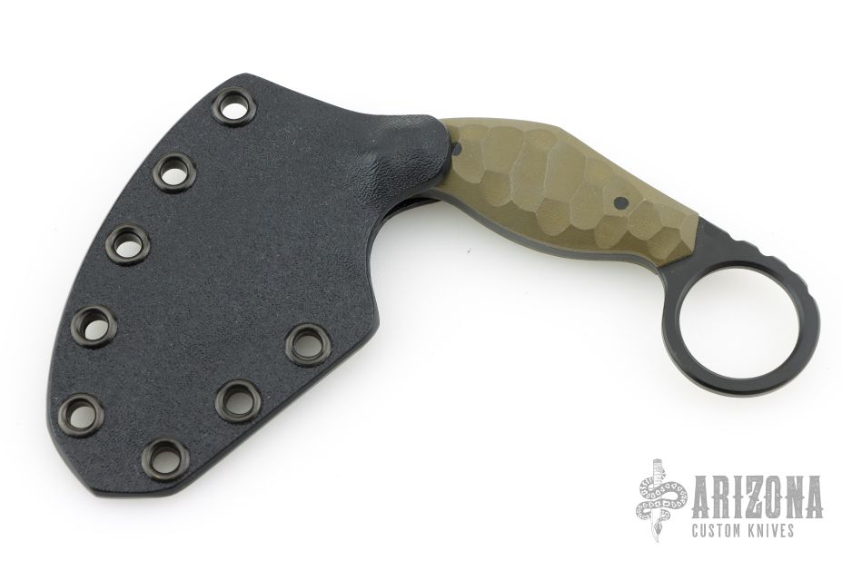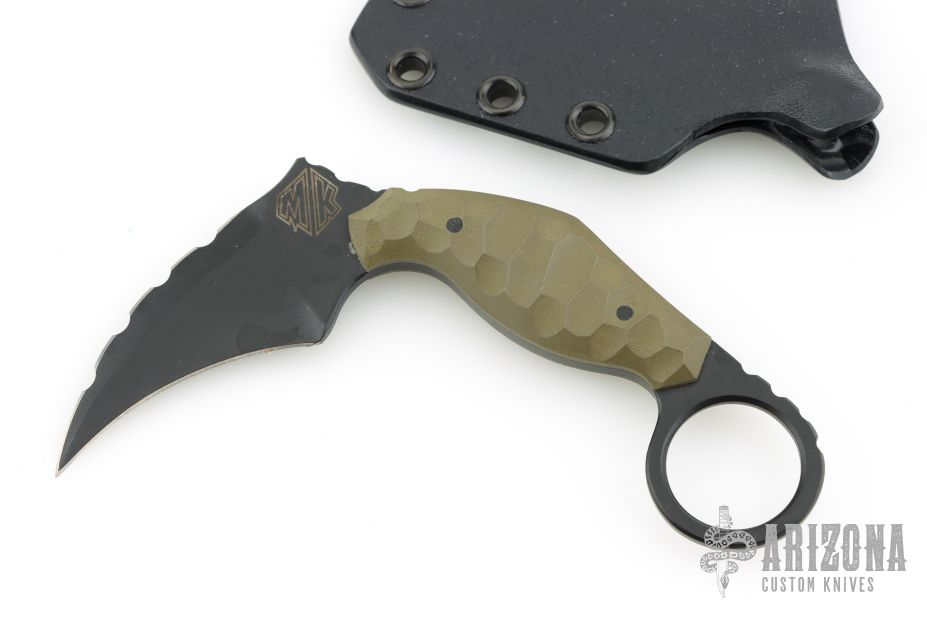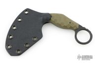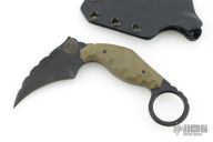 This Fenris Karambit by Paul McDaniels features a cerakoted blade with notched thumbrest and sharpened top edge, .143" blade stock and 1.275" blade depth, full tang construction with sculpted green G10 scales. Comes with a kydex sheath. Has some scuffs, excellent condition otherwise.
