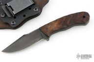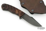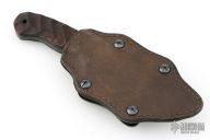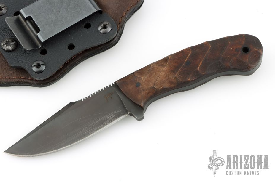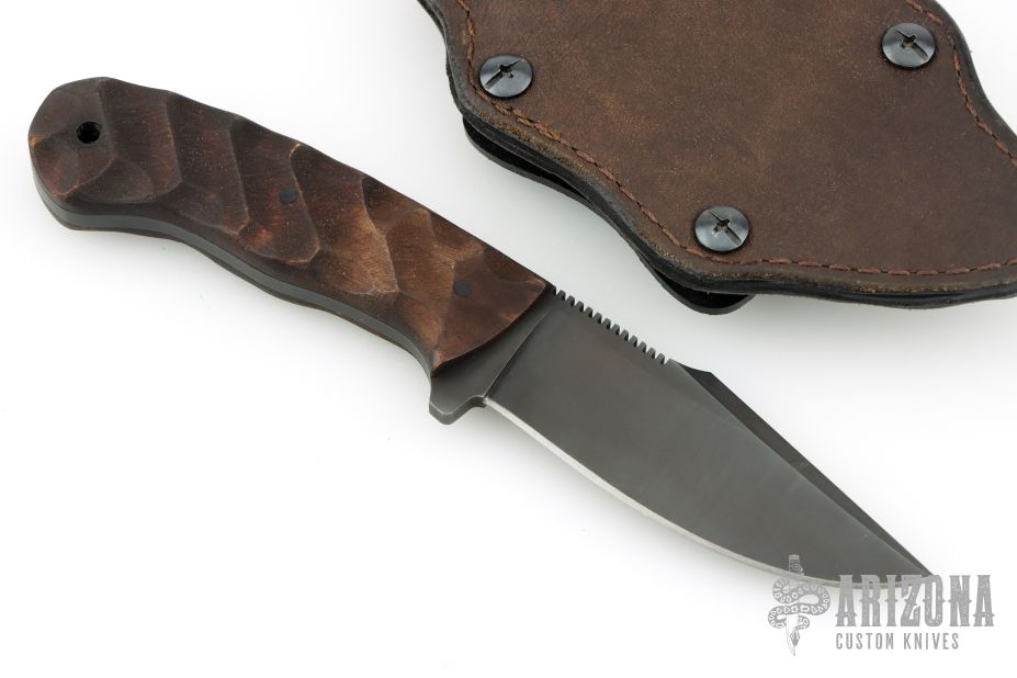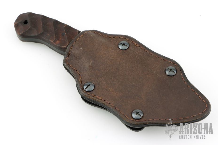 Jason Knight Design by Winkler Knives Knife Specifications Blade steel: 80CrV2 Black oxide no-glare finish Blade length: 3 1/2" Overall length: 8" Blade thickness: .189" Full skeletonized tang Thumb index file work Sheath Lined Kydex® with leather cover Spring steel, belt clip Designed for multiple carry options (See our Info page for carry options) Comes with original sheath. Has some scratches and has been sharpened, otherwise good condition.