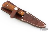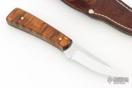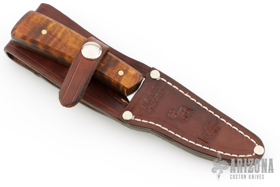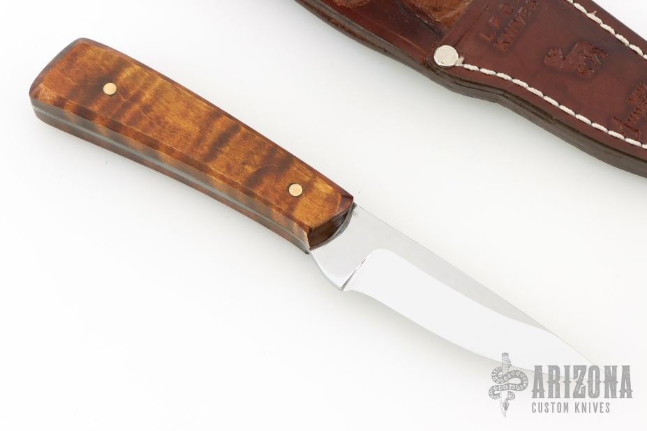 This hunter from LFOD LLC features a mirror finished blade with .136" blade stock and .901" blade depth, full tang construction. The handle has curly soft maple wood scales with brass pins. Comes with a leather belt sheath with belt loop, business card and paper. New from maker! 8670 Blade Steel.