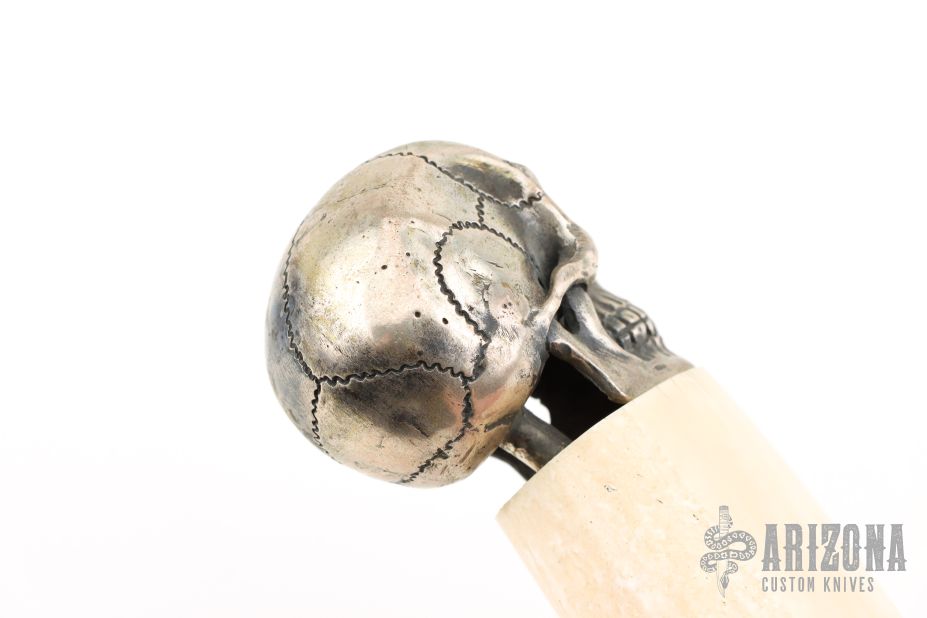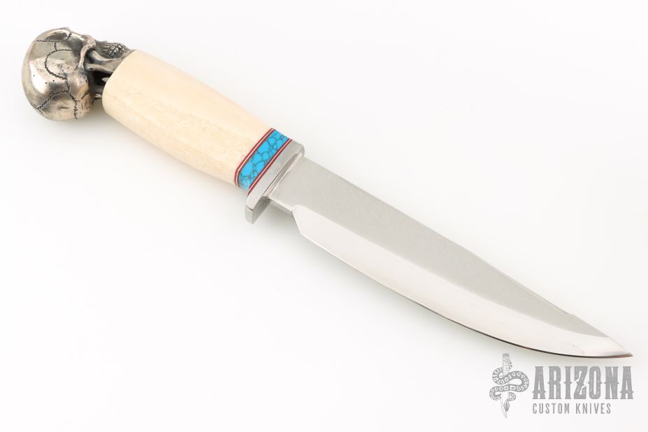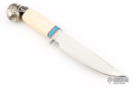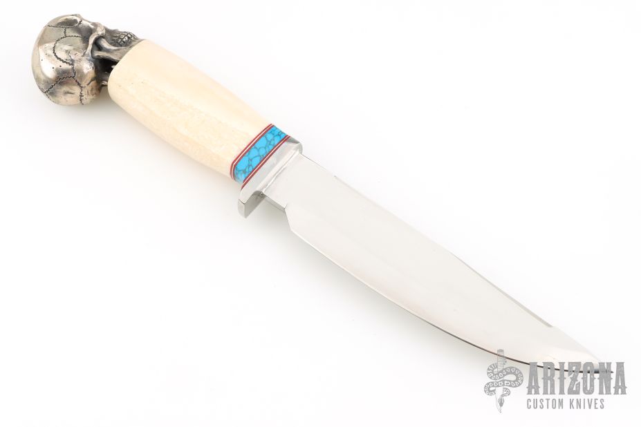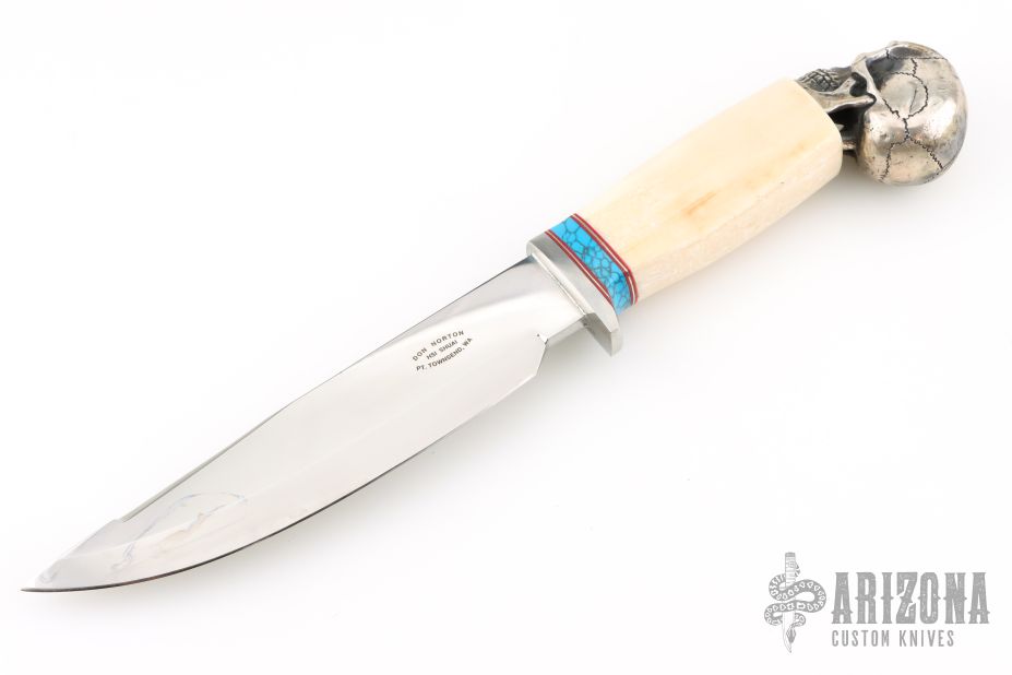 This knife by Don Norton features mirror polished clip point blade with false top edge, .267" blade stock and 1.450" blade depth, hidden tang construction. The handle has a steel guard, turquoise spacer, walrus tusk grip and a steel skull butt cap.  Excellent condition.