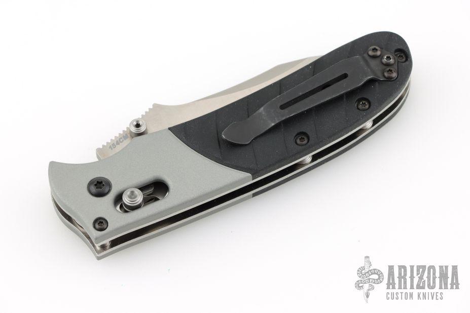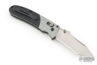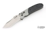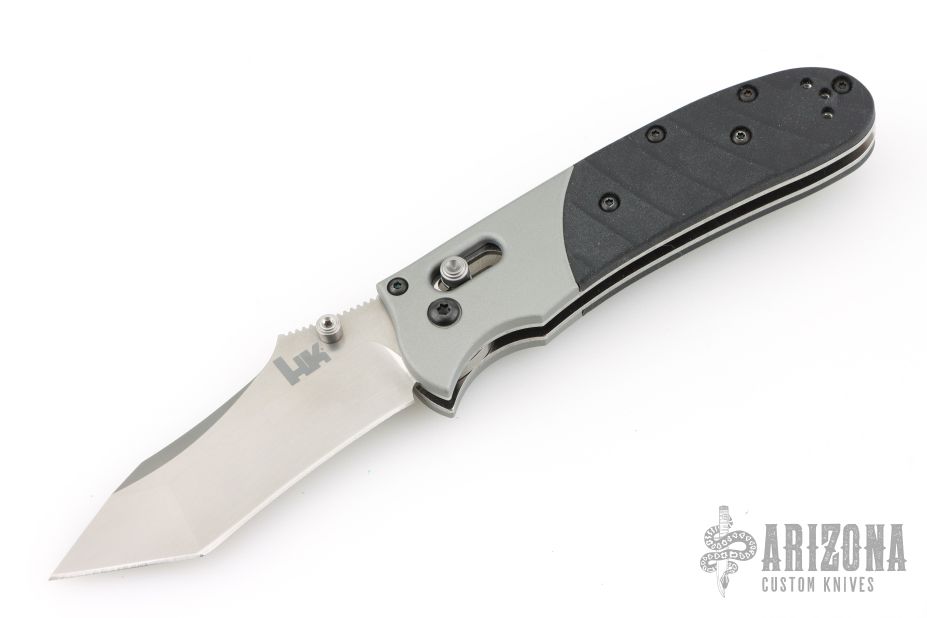 This knife by Heckler & Koch is made by Benchmade and designed by Mike Snody, it features a tanto recurve blade with notched thumbrest and dual thumbstuds. Bead blasted aluminum bolsters with a rubberized handle for sure grip. Tip up clip, left or right reversible. Nice lockup, action and blade seating. Excellent condition. Comes with original box and papers.