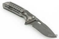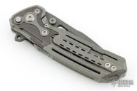 Its harpoon-style blade is crafted from CPM-MagnaCut and hardened for maximum performance, delivering the cutting authority expected from the Terminator line while maintaining excellent stability in demanding tasks. Even with its substantial blade stock, the geometry keeps the cutting action controlled and efficient, proving that strength and sharpness can coexist in a serious working folder. The fully machined titanium handle echoes the familiar lines of its predecessors but arrives thicker, tougher, and more aggressively executed. Sculpted ergonomics and detailed milling give it a commanding feel in hand. The button-operated frame lock, paired with a rear sliding safety, ensures dependable lockup and confident operation, supported by a bearing-driven action that opens with power and certainty.