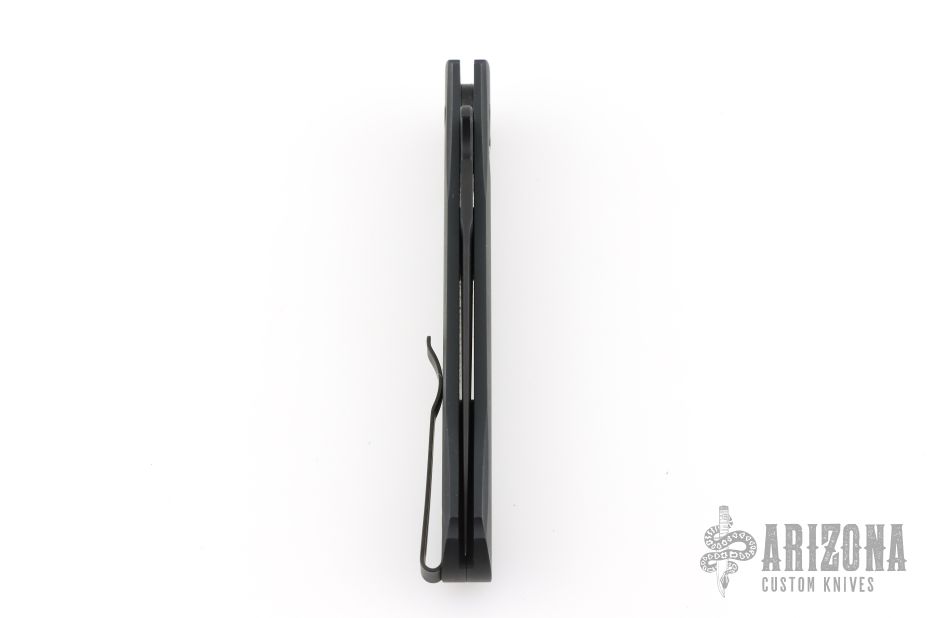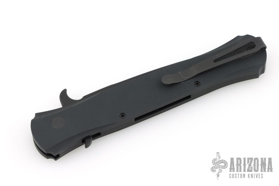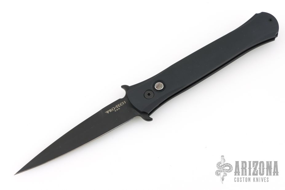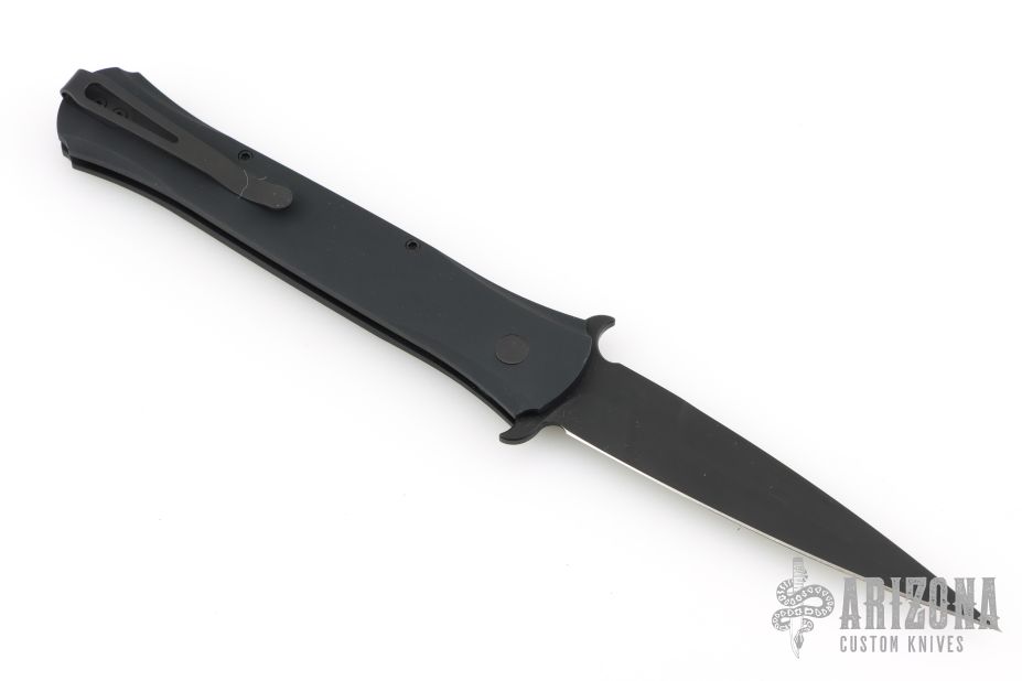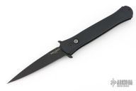 This Large Don by Pro-Tech features a black DLC finished blade with false top edge. The handle has a black aluminum handle with black tip up stainless steel clip. Comes with original box and papers. Excellent condition. Black lip pearl button.
