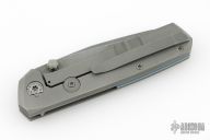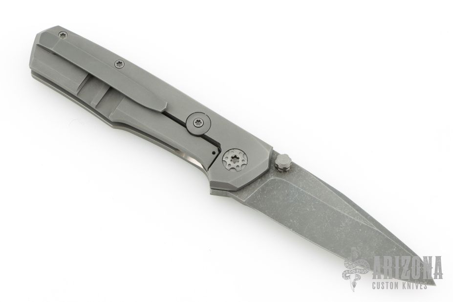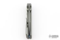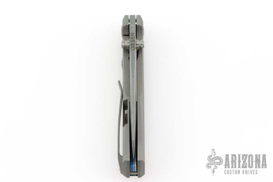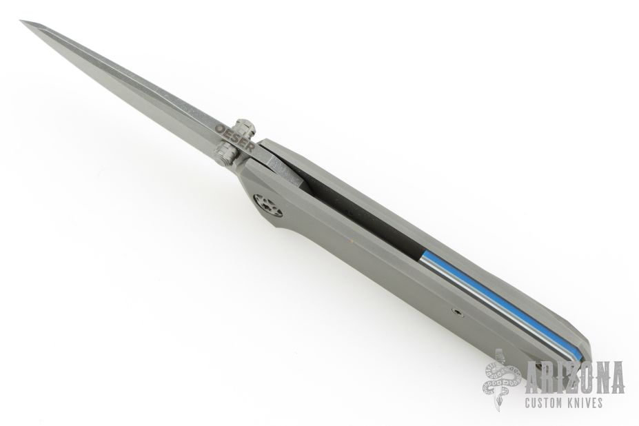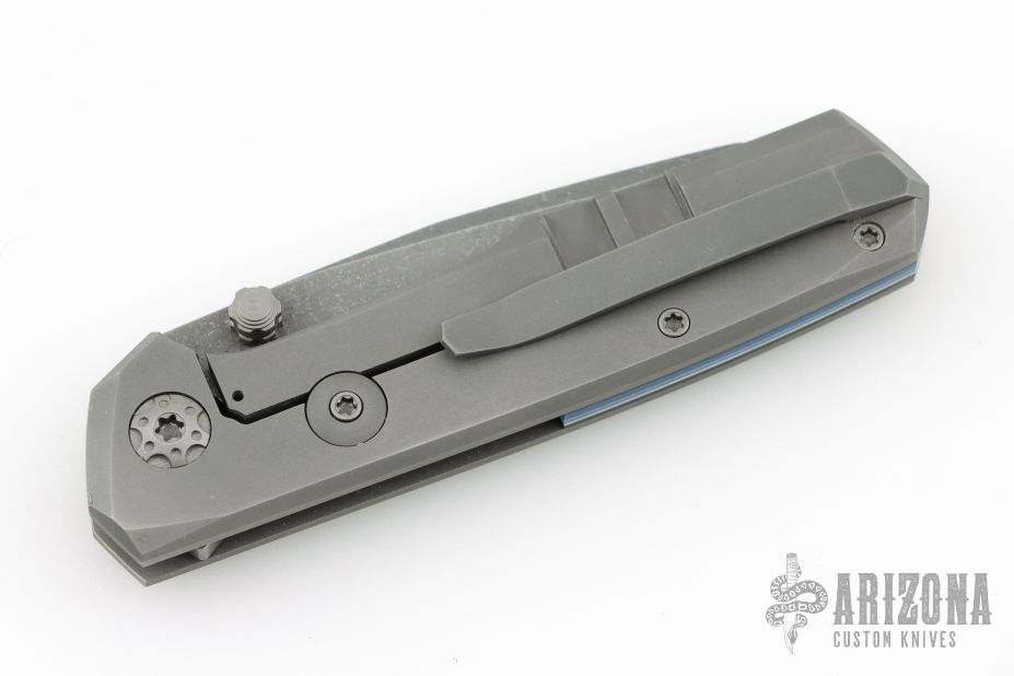This Nebo V2 by Jared Oeser features an acid-wash and tumble finished blade with false top edge, and dual thumbstuds. The handle has a bead blasted titanium frame with titanium tip up clip, and lanyard pin in pommel. Blue/black/white/grey backstrap. Nice detent, lockup and blade seating. Comes with original box, cloth, leather slip, and COA dated 9-20-21. Has some light scratches, otherwise Excellent condition.
