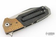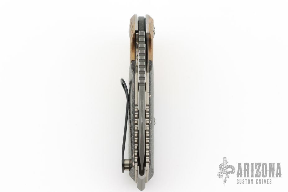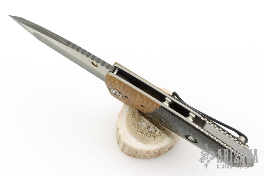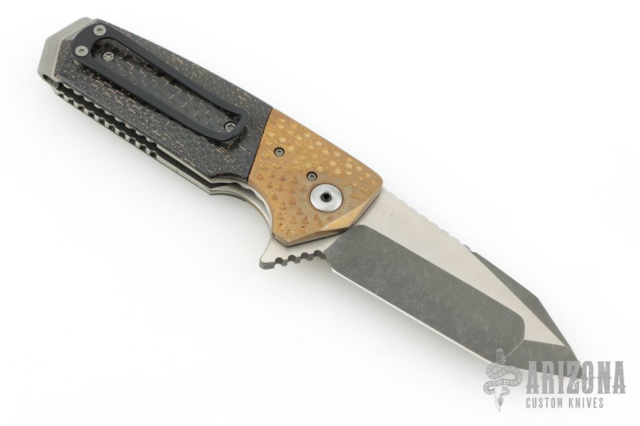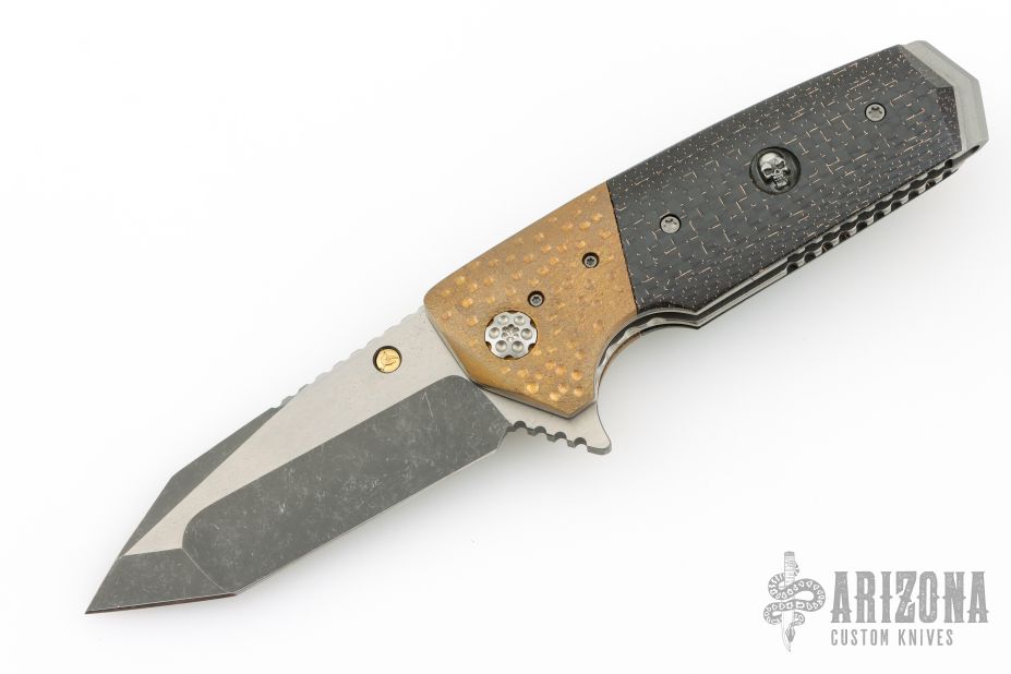 This custom flipper features a two tone blade with satin flats and acid tumbled grinds, notched thumbrest and flipper. The handle has textured bronze bolsters, lightning strike carbon fiber scales with sterling silver skull, tumbled titanium liners, carbon fiber tip up carry pocket clip, and titanium barrel spacers and bead blast titanium pommel. Flipping requires no wrist movement. Strong lock, nice detent and blade seating is dead center. Great attention to detail. Includes a leather case. Excellent condition. #1