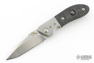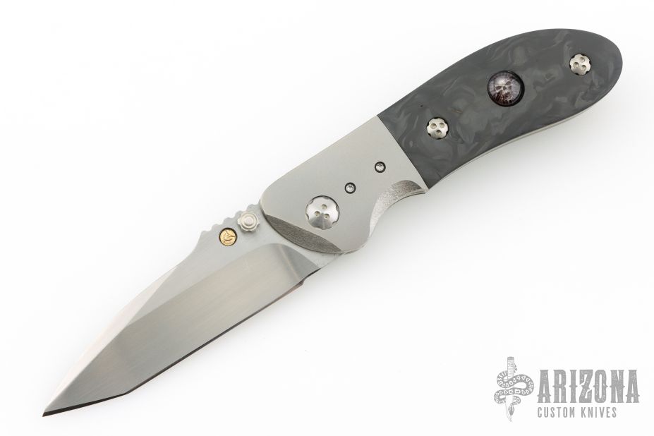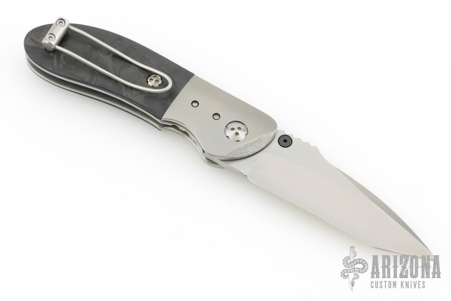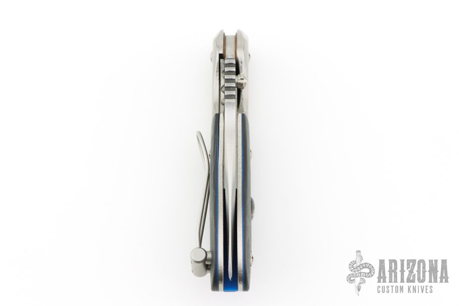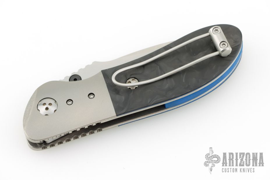 This linerlock folder by Allen Elishewitz features a hand rub satin finished tanto blade with single thumb stud and notched thumbrest. The frame, bolsters, and liners are bead blasted titanium with orange peel finished accents. Marble carbon fiber covers, with skull inlay, and wire clip, tip up carry. The backspacer is blue G-10. Has nice lockup and blade seating. Comes in a zipper case. Has a couple light scuffs, excellent condition.