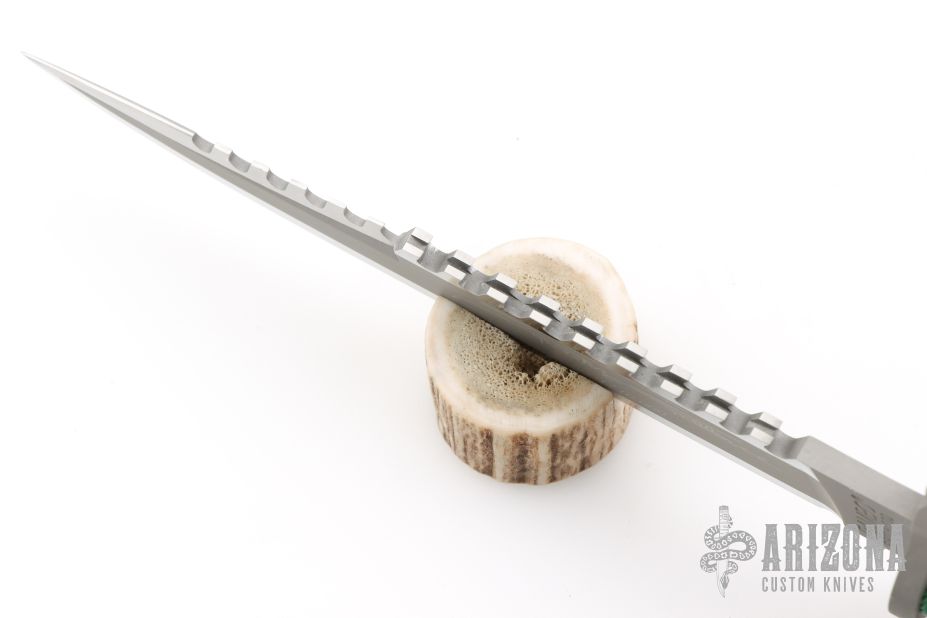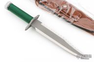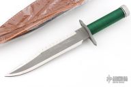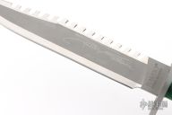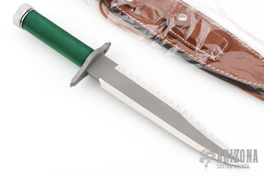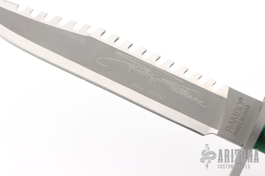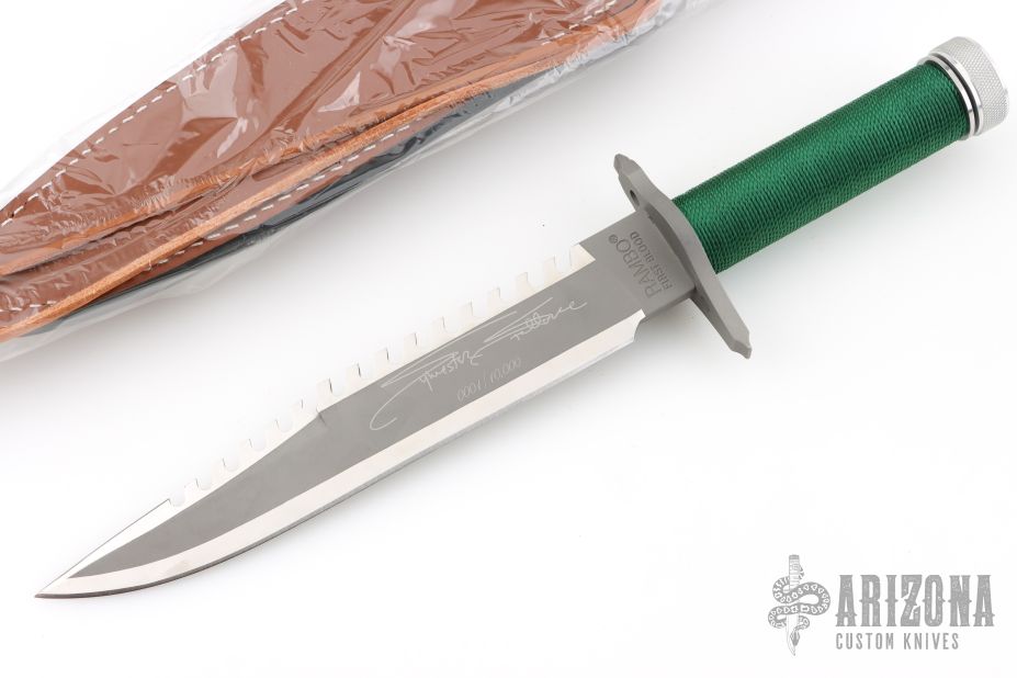 This Sylvester Stallone Signature Edition Rambo First Blood by Master Cutlery and Hollywood Collectibles Group features a two tone blade with bead blasted center and satin finished grinds, serrated top edge and saw-teeth on blade spine, .230" blade stock and 1.494" blade depth, hidden tang construction. The handle has a bead blasted stainless steel double guard with flat and Phillips head screw drivers, hollow cord wrapped handle, and aluminum removable butt cap with compass and an O-ring to make it water-proof. Comes with original box and brown leather sheath. Excellent condition. 1 of 10,000