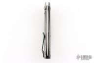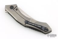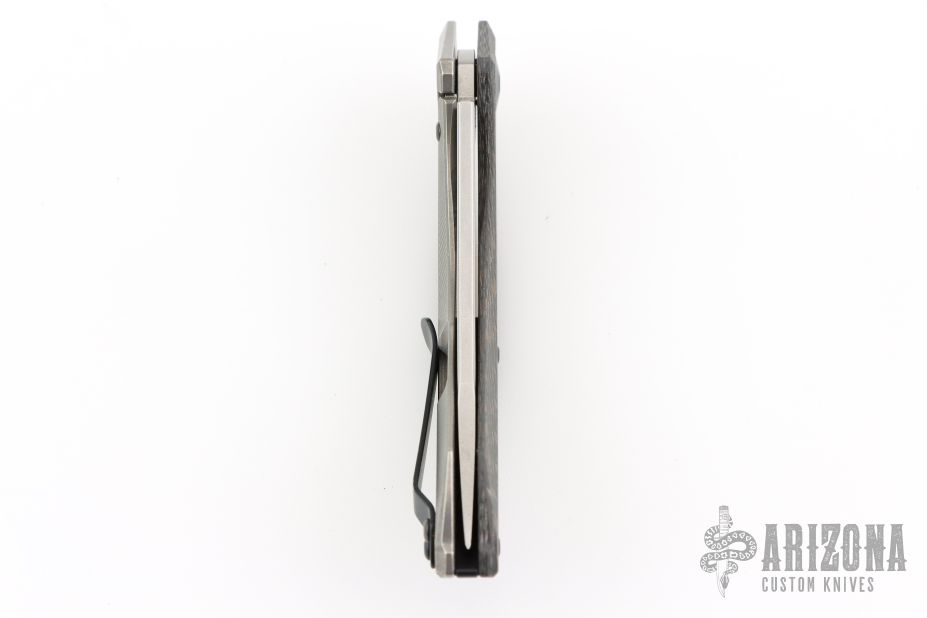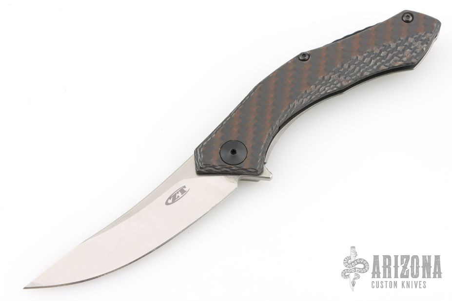 This 0460 Sinkevich Design flipper by Zero Tolerance features a satin finished upswept blade with flipper and swedge. The handle has a brown/black carbon fiber and tumbled titanium frame, black aluminum backspacer and a tip up reversible titanium clip. Nice detent, lockup and blade seating, rides on bearings. Has stainless steel lockface insert and overtravel stop, ceramic detent ball. S/N 0255. Comes with original box and papers. Has some scuffs and scratches, great condition otherwise.