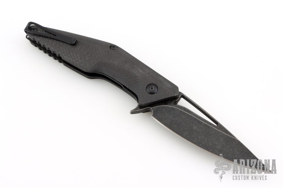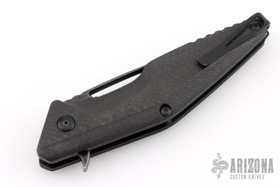 This Division Flipper by Brous Blades features a dark wash finished drop point blade with thumbhole and flipper. The handle has a carbon fiber scales over titanium liners and barrel spacers. The steel deep carry pocket clip is reversible for left/right hand, tip up carry. Lanyard bail on pommel. Great blade seating, action and lock up. Comes with original box and card. Has a couple light scuffs, excellent condition otherwise.