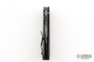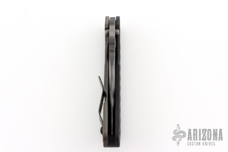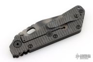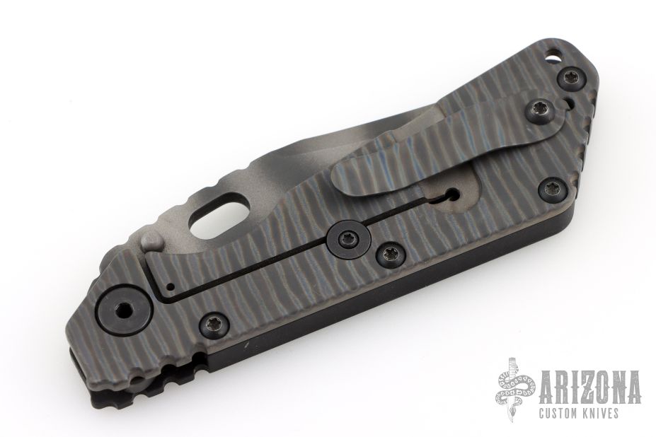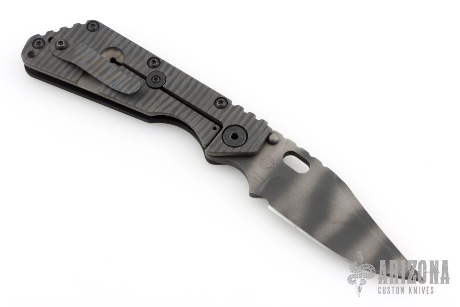 This Mick Strider SMF Bowie framelock folder features a tiger stripe blade with thumbhole and notched thumbrest. The handle has a black aluminum and flamed titanium frame with titanium clip, tip up carry, lockbar stabilizer. Jimping on blade spine. Nice lockup, detent, and blade seating. Comes in a zipper case. Has some scuffs, scratches, and some marks on the blade. Good condition; great user condition otherwise.