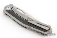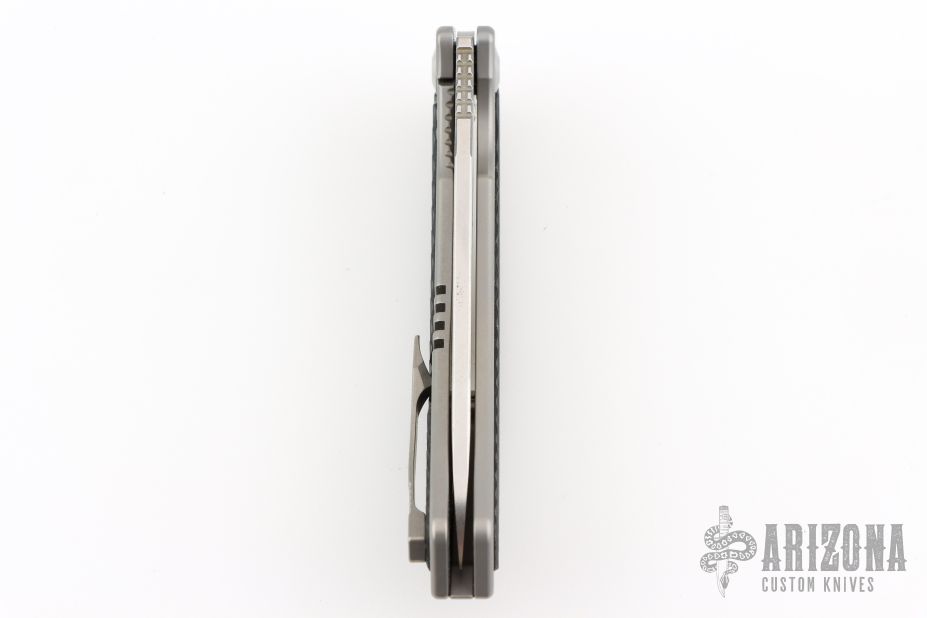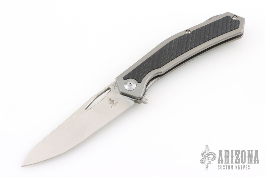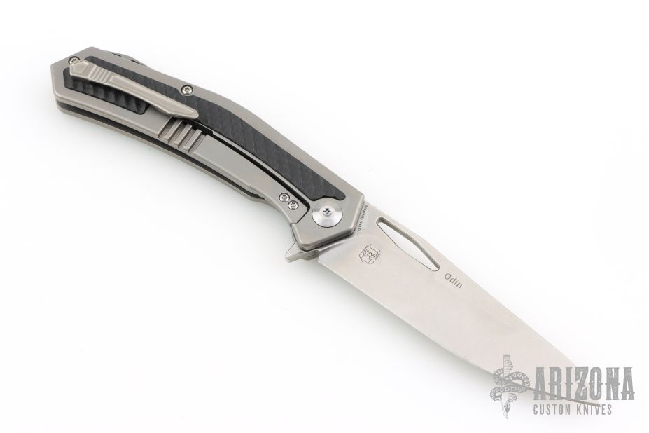 The Kizer Odin was revealed at Blade Show 2018! It features a sleek S35VN blade with a flipper and elongated thumb hole. The Odin has a curved titanium frame lock handle with a textured carbon fiber inlay for added grip and style. Comes outfitted with a blue anodized pocket clip.