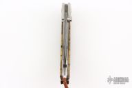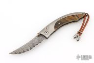 This B11 by William Henry features a Wave VG-10 core Damascus blade, single thumbstud with citrine inset, matching inset in button release. The handle has a titanium frame with yellow spalted birch inlays, titanium barrel spacers, sterling silver lanyard bail, and a braided leather lanyard with silver beads. Comes with black leather pouch with clip and original box and COA dated Mar 01, 2022. #12/50. Excellent condition.