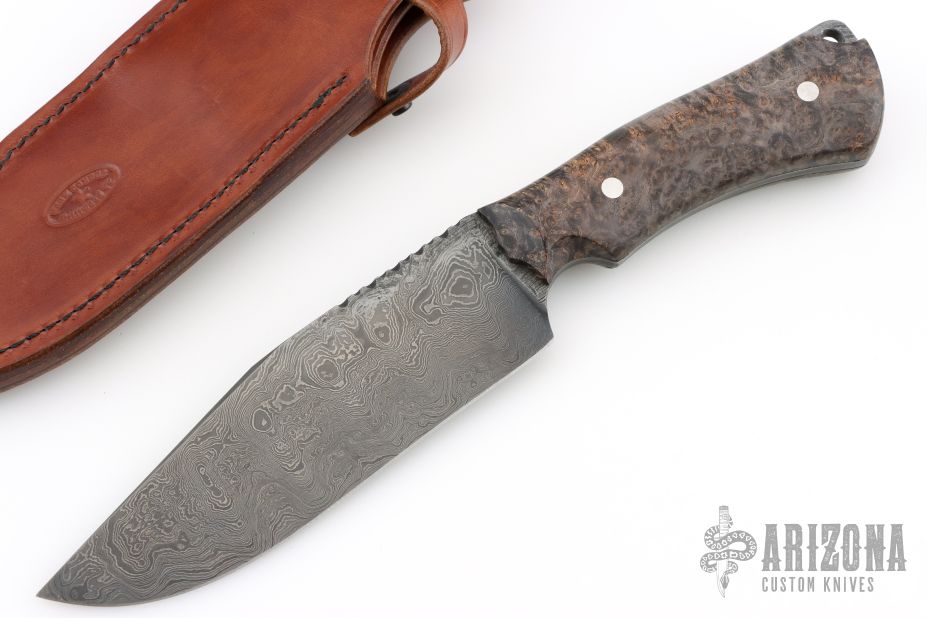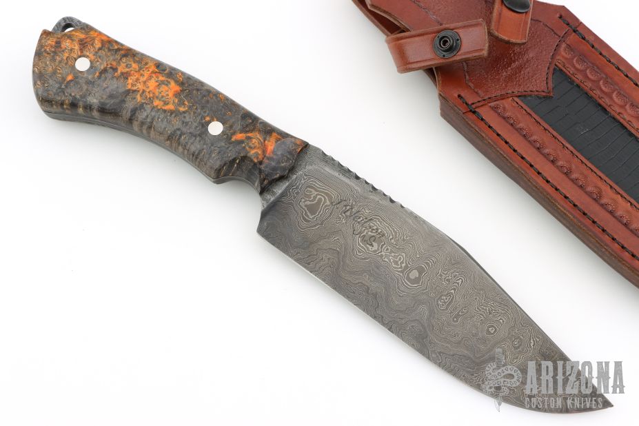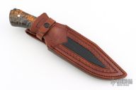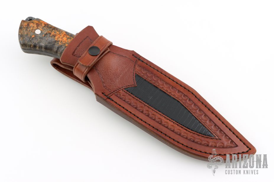 As a firm believer that a knife and sheath should come as a set and complement each other, each fixed blade knife comes with a custom fitted sheath. The leather work is done by some of the best traditional and primitive style leather crafters in the USA, using a variety of leathers, both domestic and exotic. Each sheath is designed for each individual knife using custom carving, tooling, inlays, etc."