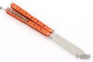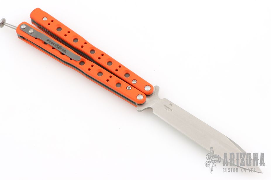 This Model 51 Morpho Balisong from Benchmade has a satin finished D2 stainless steel spear point blade. Handle is orange G10 with bead blast finished liners and matching titanium tip up clip. Comes with original box, papers, and pouch. Has a couple light scuffs, excellent condition otherwise.