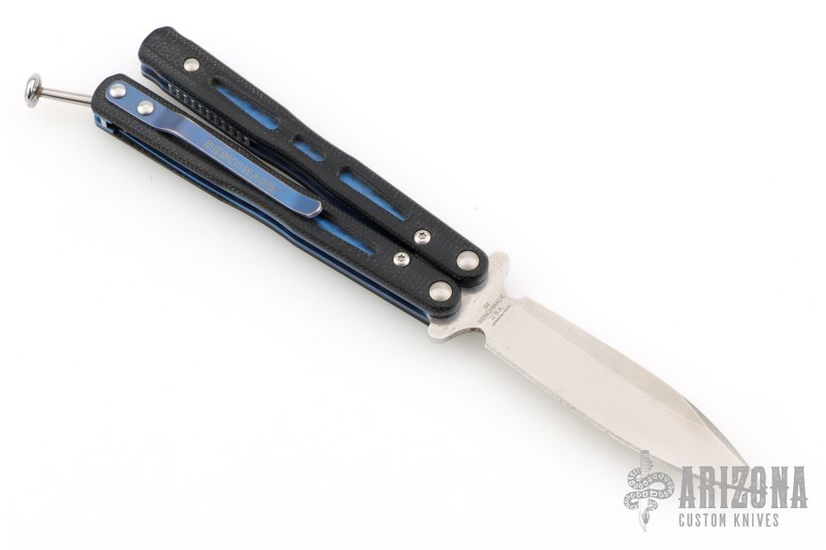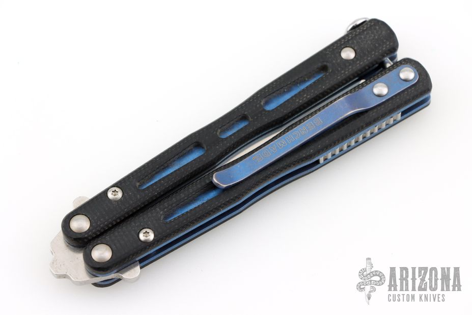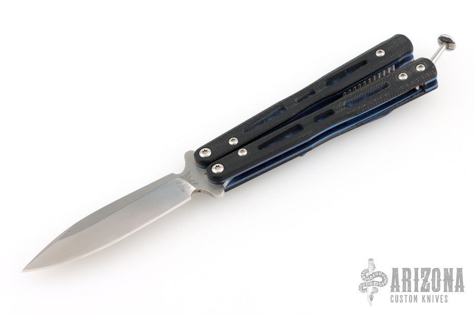 This Model 32 Morpho Balisong by Benchmade has a stonewashed spear point blade. Handle is black G-10 with blue anodized titanium liners and milled stainless steel spacers. Blue anodized titanium tip up clip. Has some scuffs and scratches, and marks on the blade. Great condition overall.