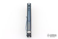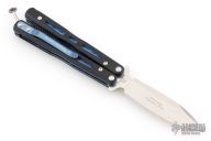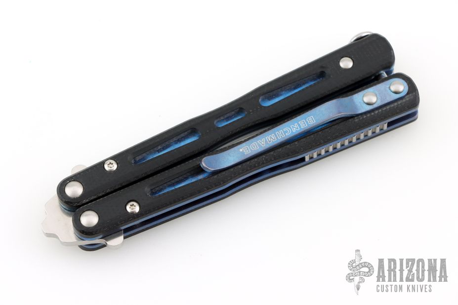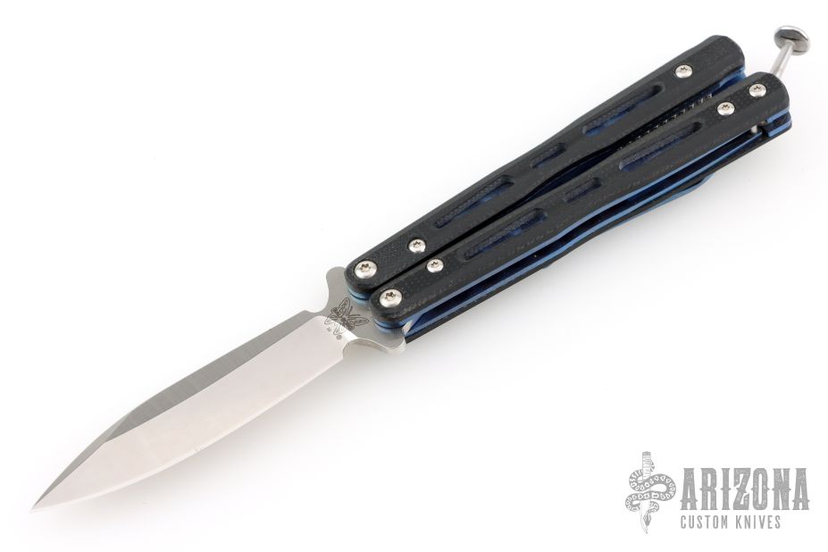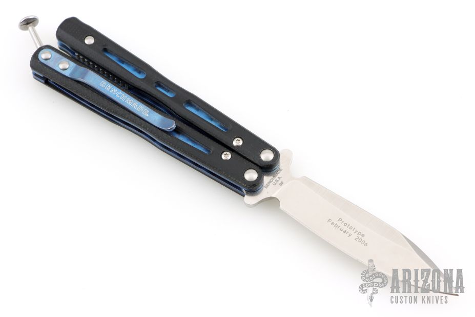 This Model 32 Morpho Balisong Prototype by Benchmade has a machine satin spear point D2 stainless steel blade. Handle is black G-10 with blue anodized titanium liners and milled stainless steel spacers. Blue anodized titanium tip up clip. Blade marked Prototype February 2006. Has some light scuffs, excellent condition otherwise.