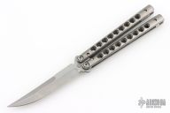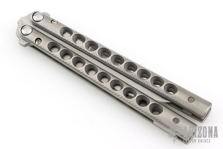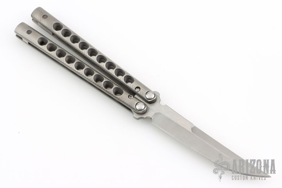 This Balisong by Biegler Blades features a stonewash finished blade with false top edge. The handles are milled titanium with titanium spacers. Has some marks on the blade and handle, great overall condition.