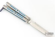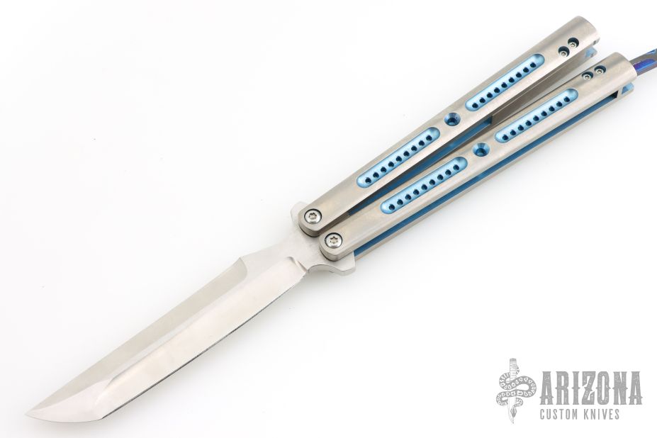 This balisong by Shawn Greacen features a satin finished blade with swedge. The handles are tumble finished titanium with titanium spacers and Zircuti T-latch. Has some light scratches, great overall condition.
