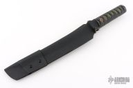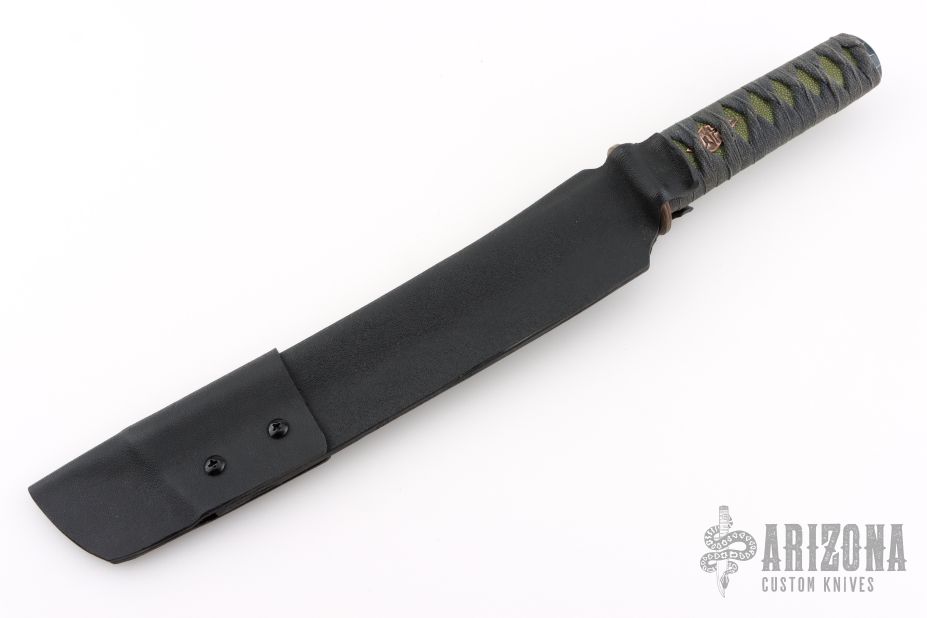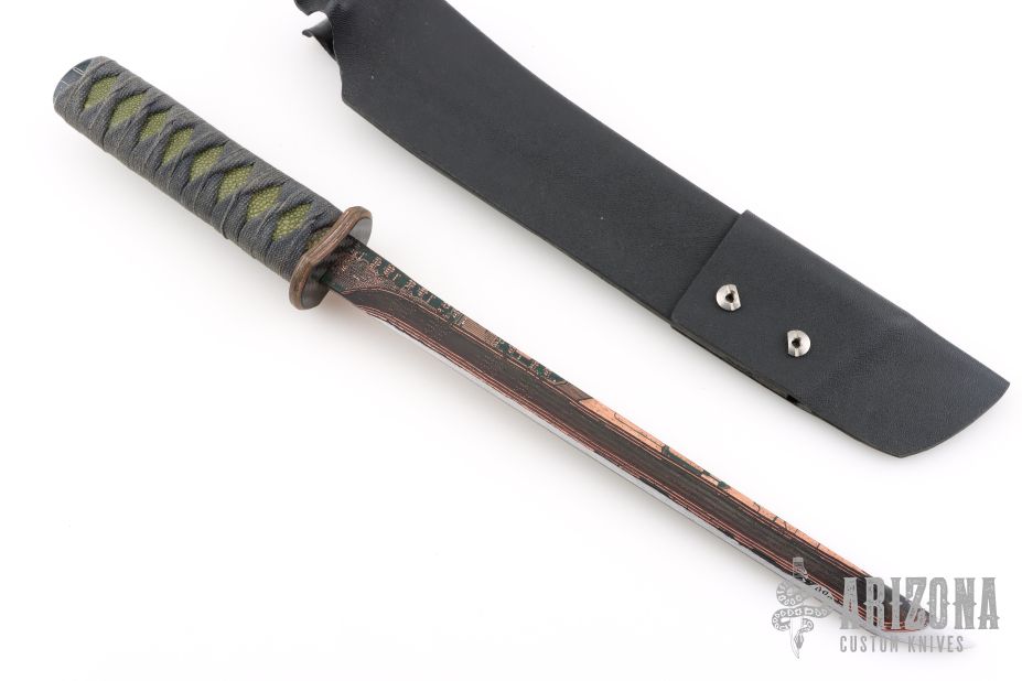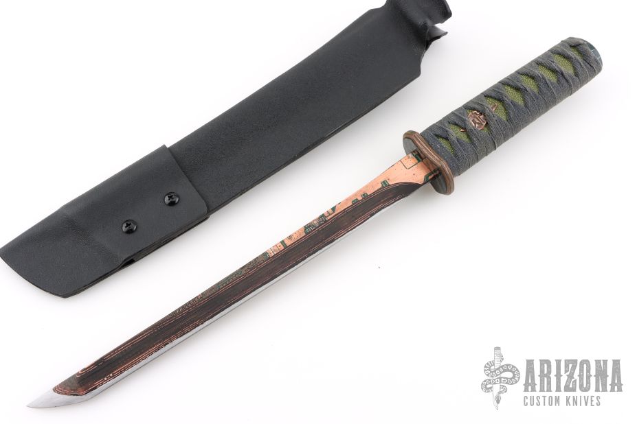This Wakizashi by Warren Thomas features a circuit board cladded, steel core tanto blade with .287" blade stock and .830" blade depth. The handle has a carbon fiber and copper tsuba, with WT logo copper menuki, tsukamaki wrapped handle with green stingray and composite cap. Comes with makers card dated Sept 21st 2025. Excellent condition.