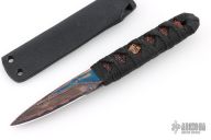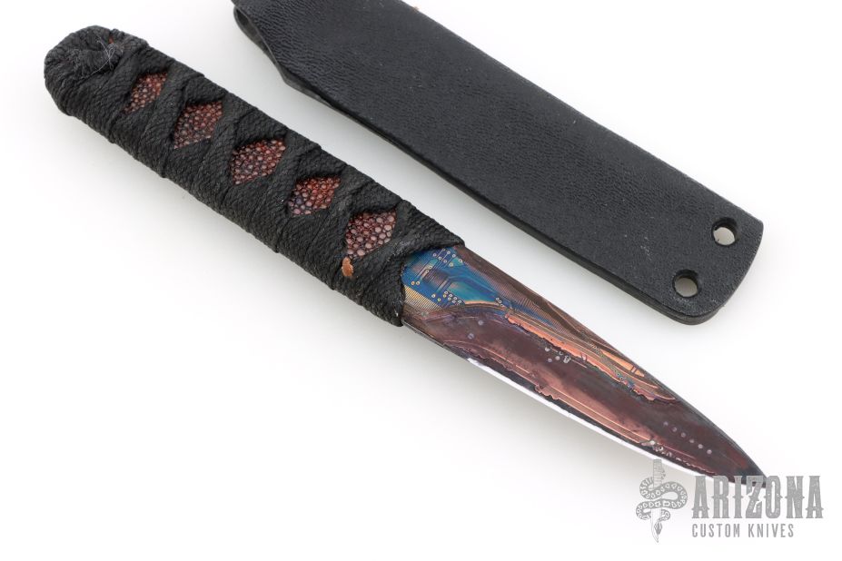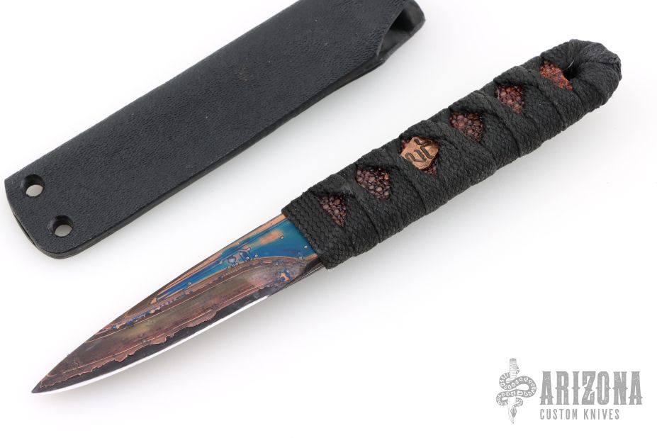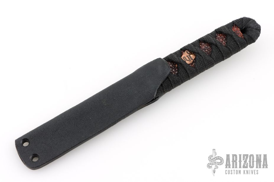 This tanto by Warren Thomas features a circuit board cladded, ceramic core tanto blade with .224" blade stock and .852" blade depth. The handle has a with WT logo copper menuki, tsukamaki wrapped handle with orange stingray underlay. Comes with makers card dated Mar 8th 2025. Excellent condition.